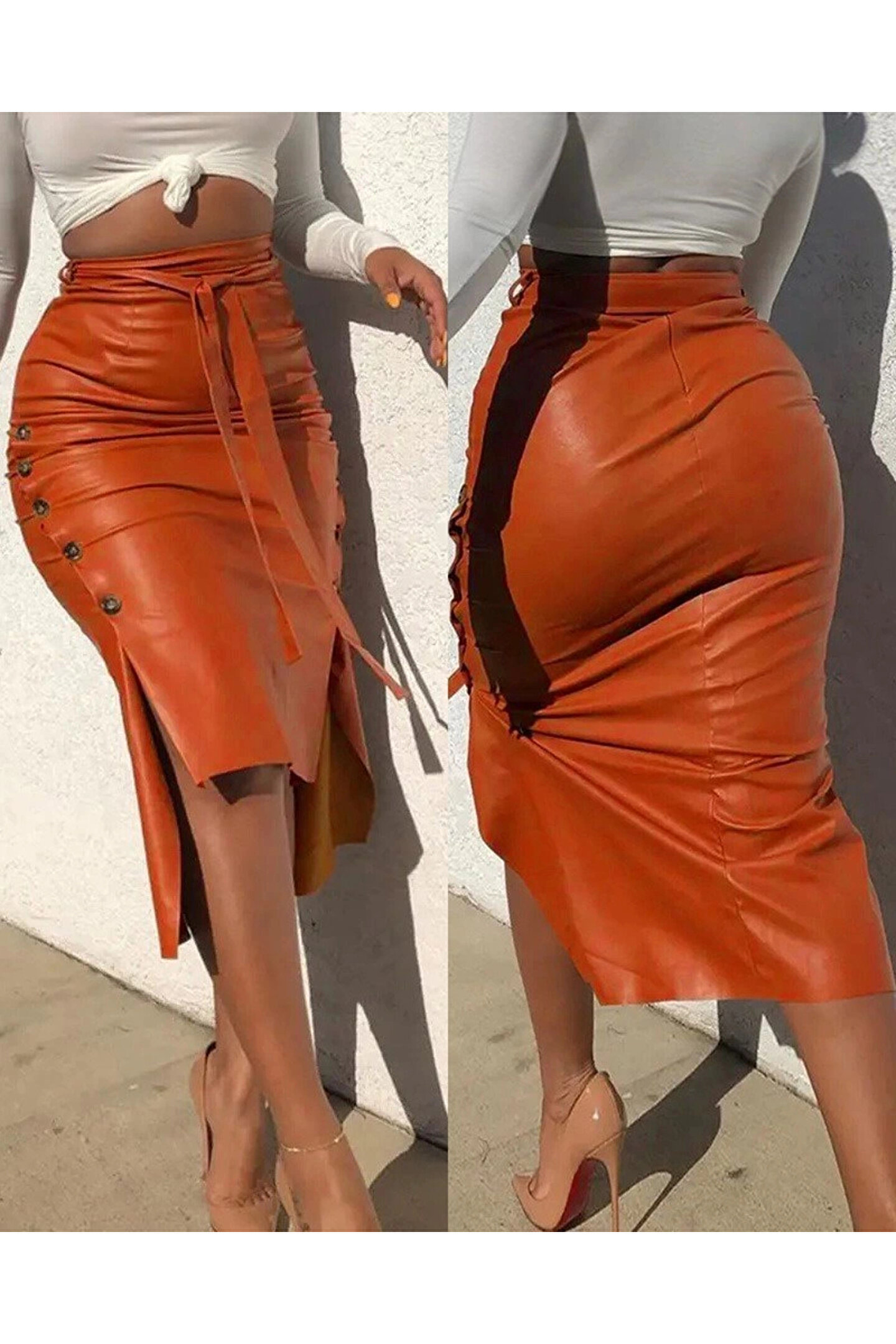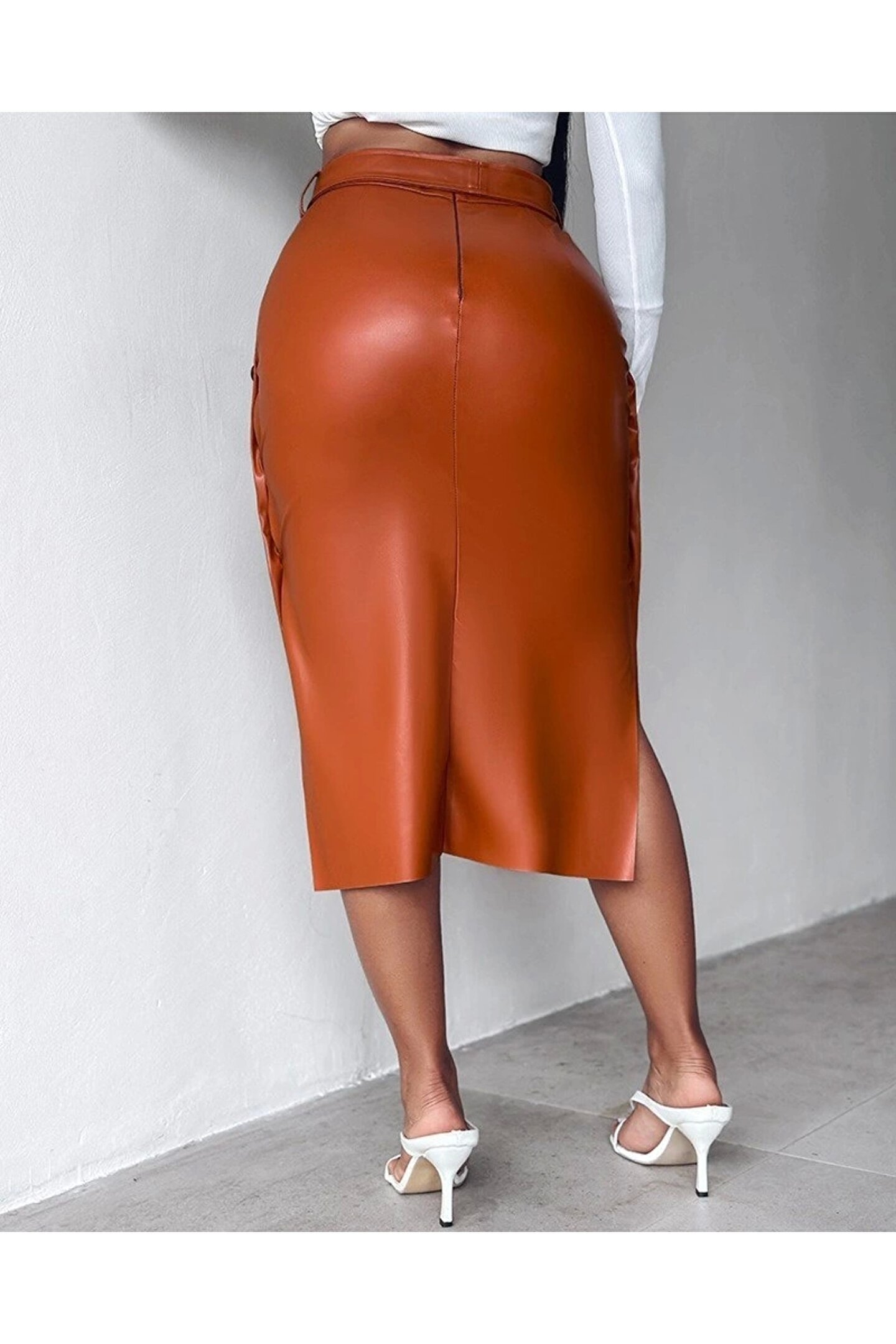Kadın Yüksek Bel Kuşaklı Yanlardan Düğmeli Mini Deri Etek