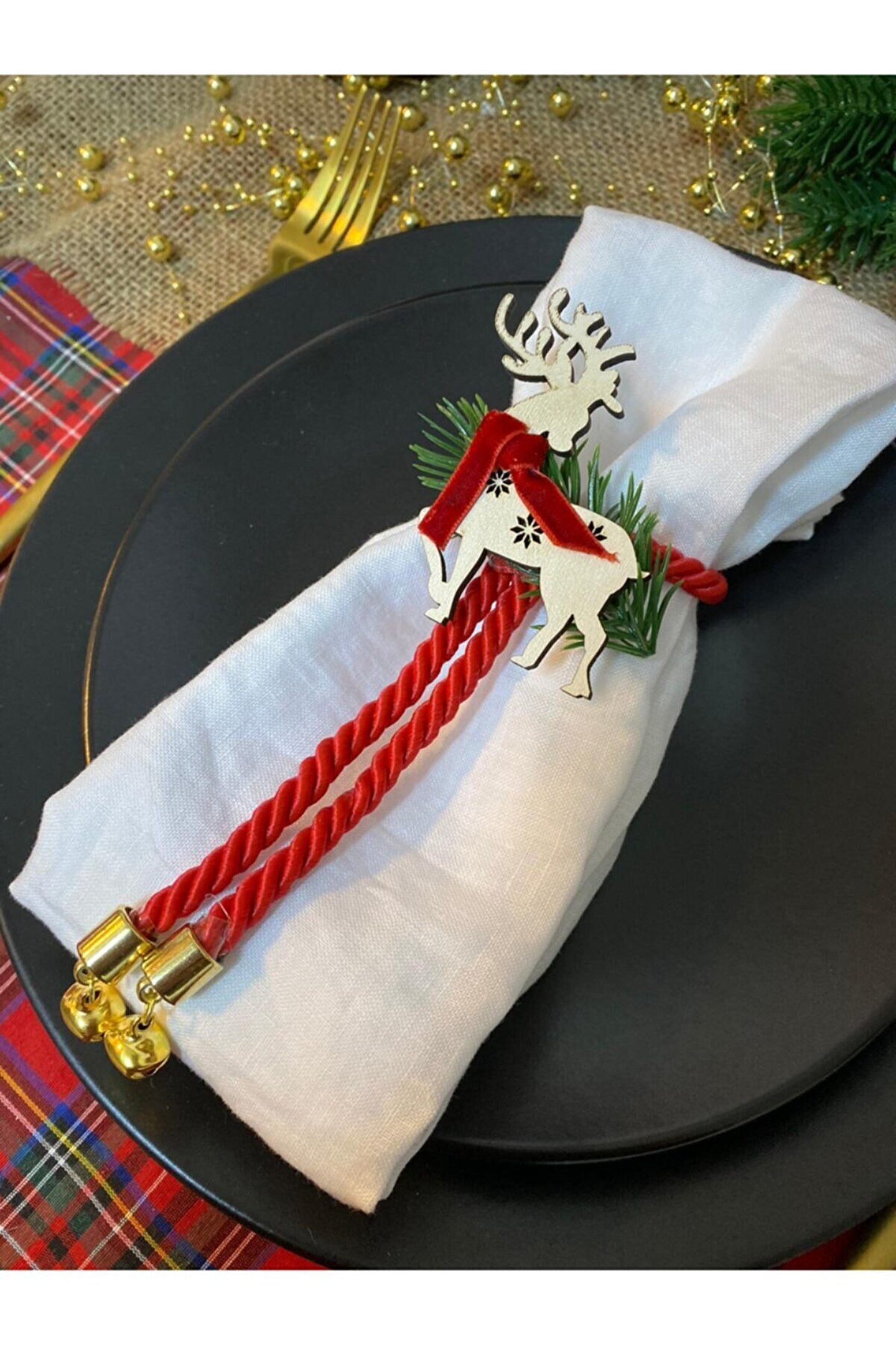 Motif Aksesuar 6lı Set Ahşap Ren Geyikli Ve Çanlı Yılbaşı , Yeniyıl Noel Temalı Peçete Halkası