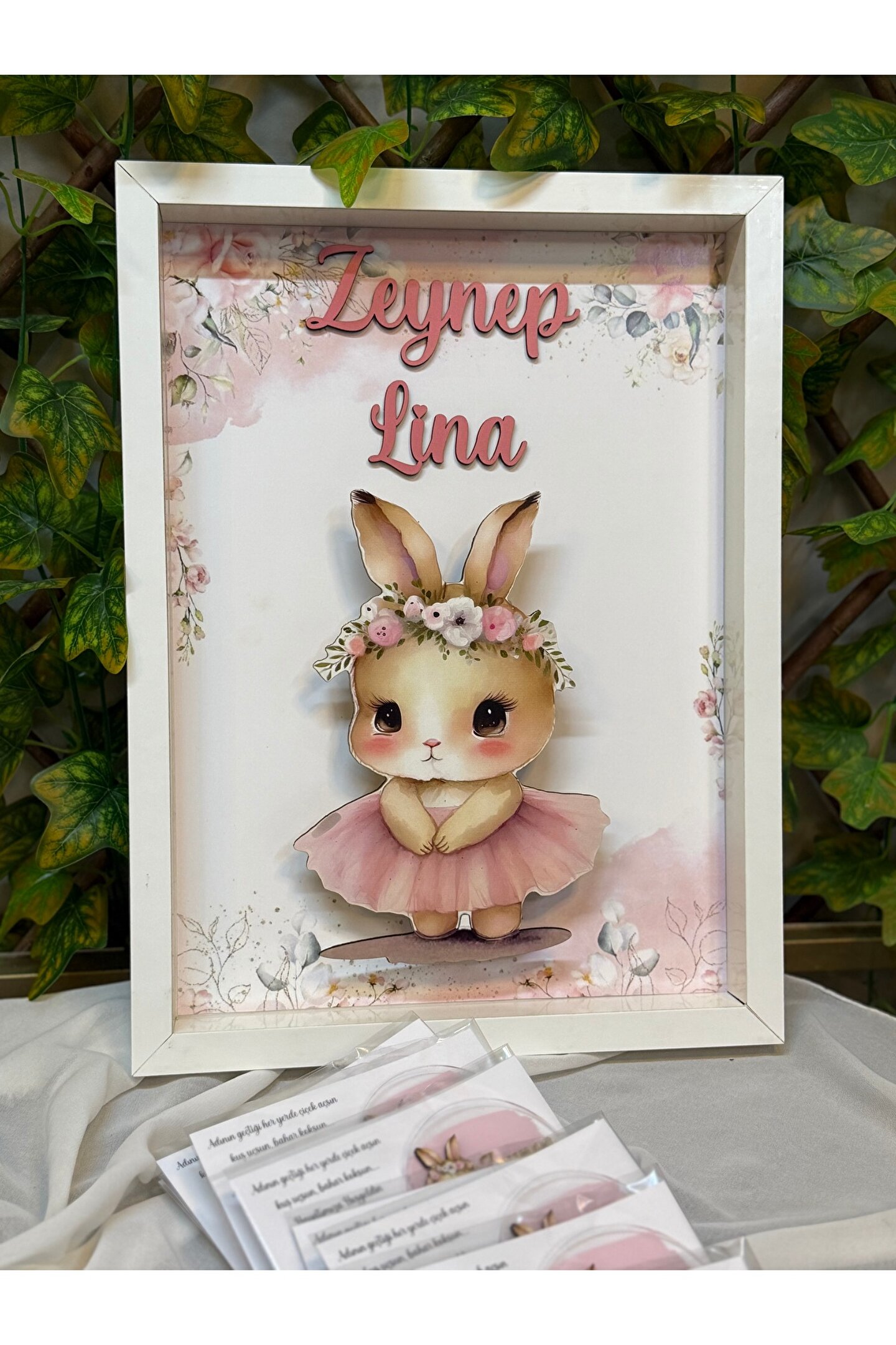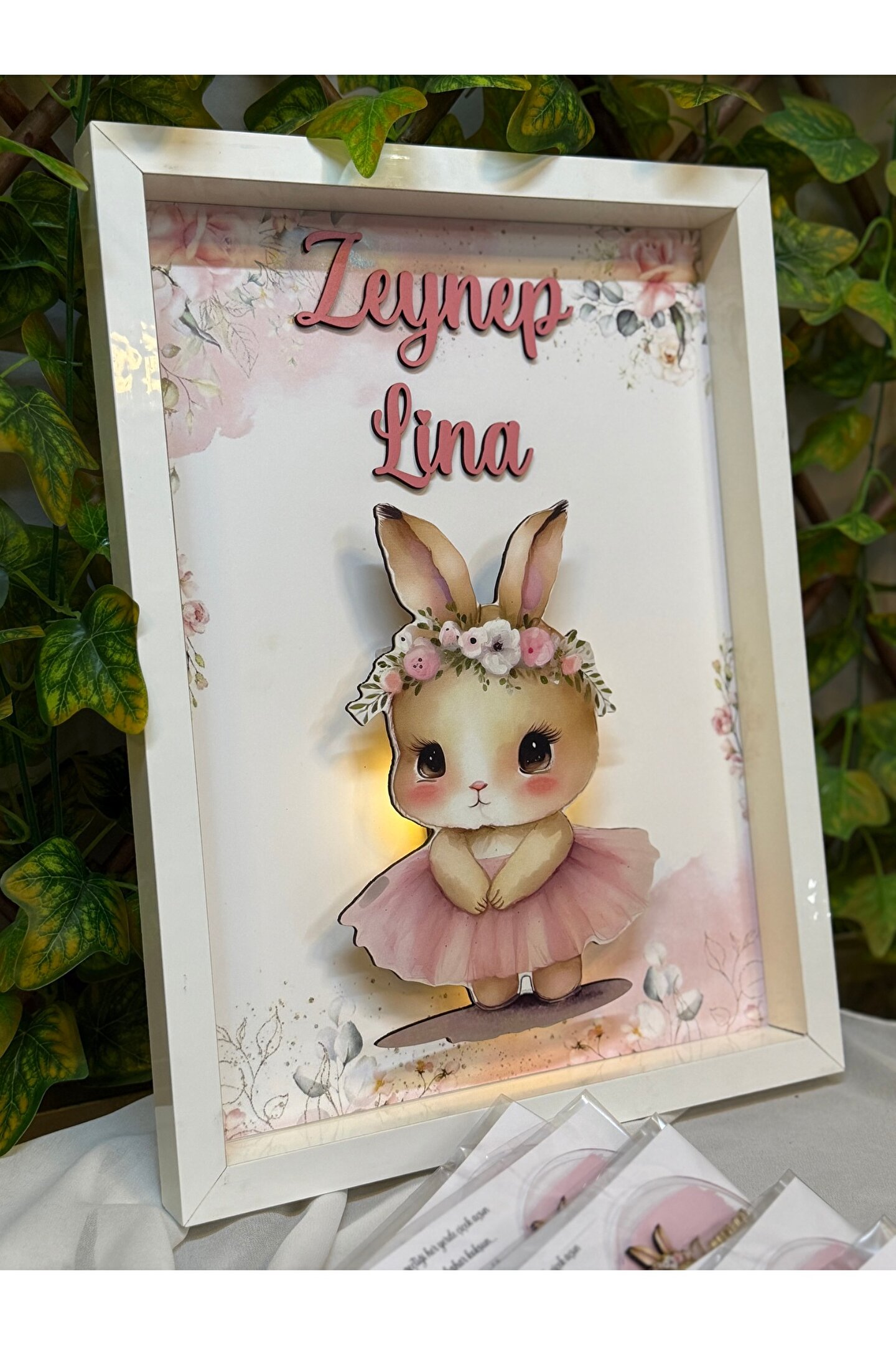 Bebeğinizin ismine özel tasarlanan ledli bebek kapı süsü Çok tatlı tavşan temasıyla bebeğinizin odası güzellik katacak Ahşap ürün olması sebebiyle dayanıklı ve uzun süreli kullanım sağlar Ledi sayesinde bulunduğu ortama loş bir ışık verir Ahşap kapı süsümüzün 40cm -30cm ölçülerindedir.