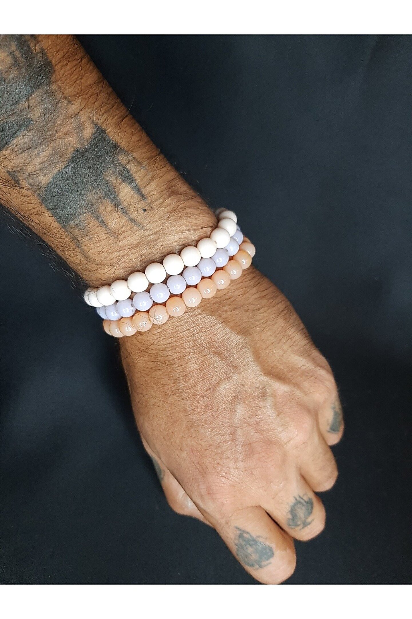 - Üç farklı cam boncuk bileklikten oluşan set, hem kadınların hem de erkeklerin kullanımına uygun olarak tasarlanmıştır.; - Her bileklikteki oval şekilli cam boncuklar, zarif ve şık bir görünüm sunar.; - Kolay bakım imkanı sağlayan bu bileklikler, nemli bir bez ile temizlenebilir; böylece uzun süre ilk günkü gibi kalır.; - Unisex tasarımı sayesinde herkes tarafından rahatlıkla tercih edilebilir; yetişkinler için idealdir.; - Üretiminde kullanılan cam malzeme, dayanıklılığı ve estetik duruşuyla dikkat çeker.; - Türkiye menşeli olan bu ürünler, yerel üretim avantajını yansıtarak kalite standartlarına sahiptir.;
