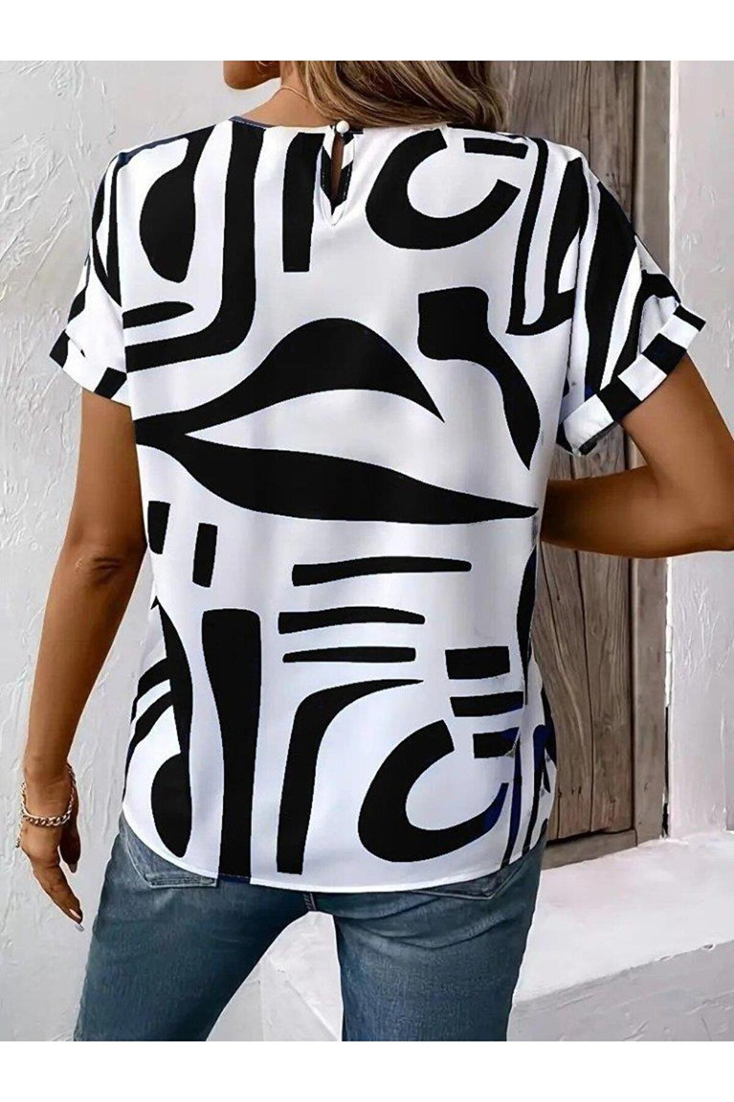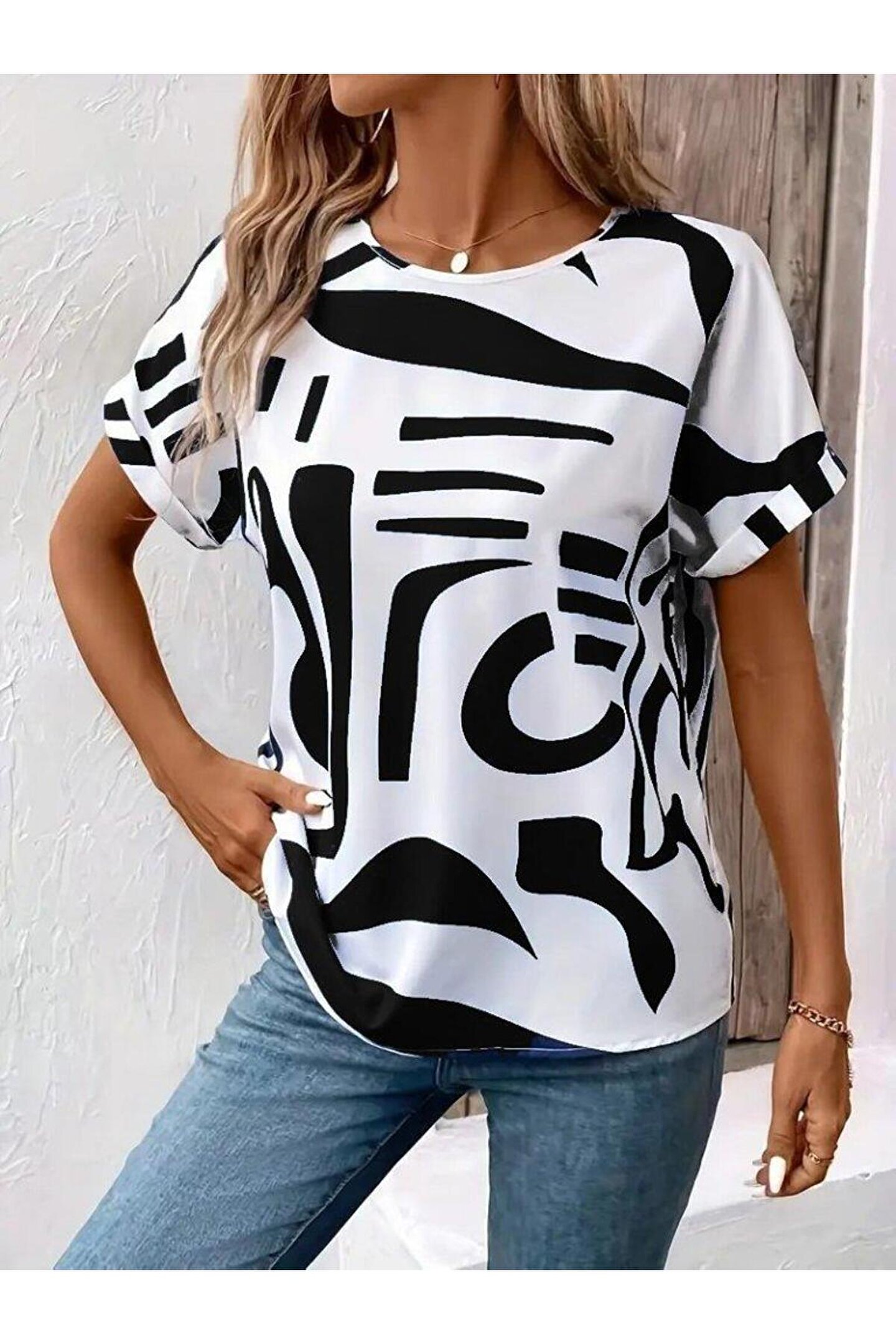 Kadın Kısa Kollu Yuvarlak Yaka Desenli Süprem Bluz