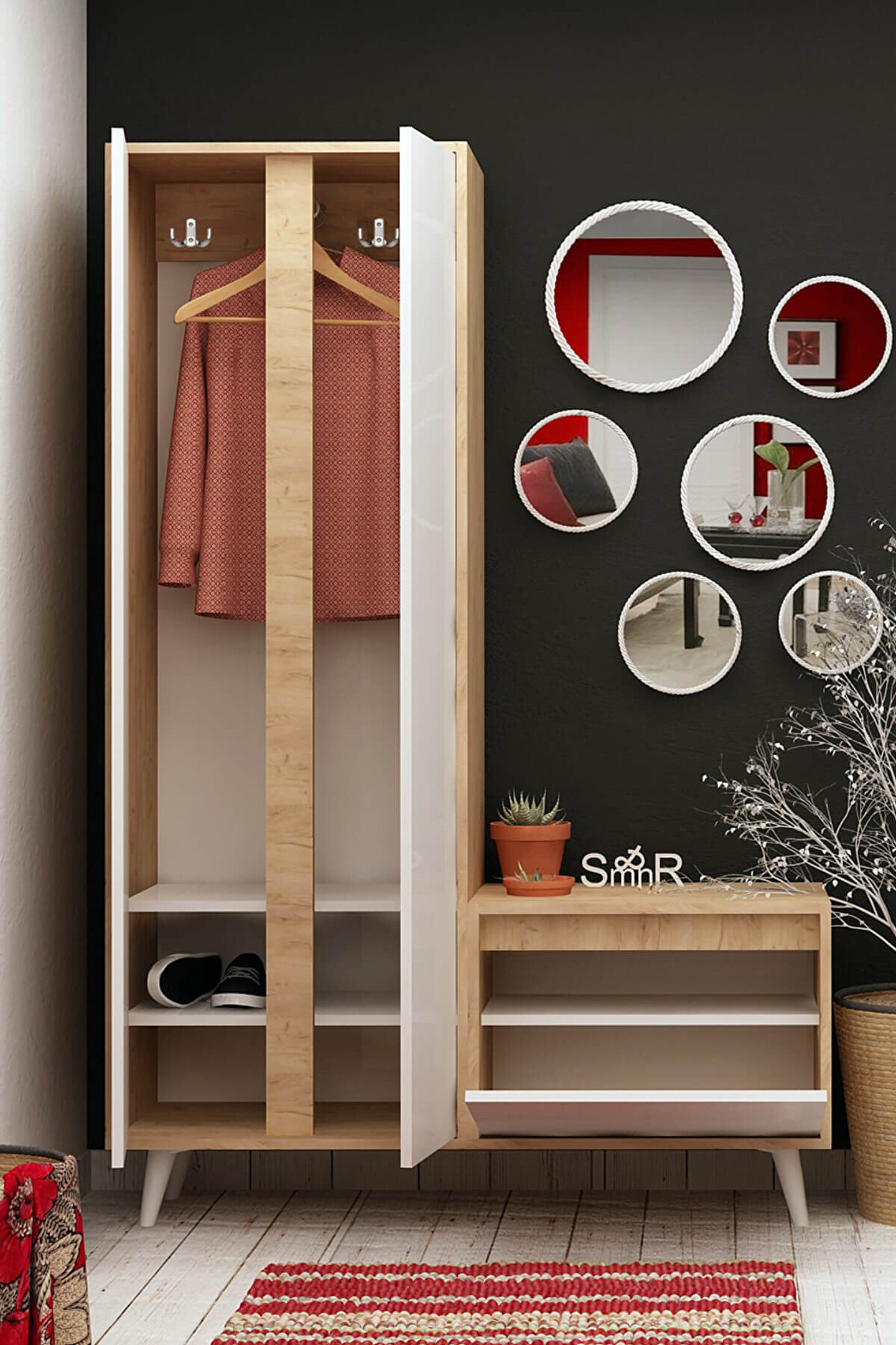 Ürün Ölçüleri;G120 cm D35 cm Y182 cm;G:Genişlik D:Derinlik Y:Yükseklik;Malzemeler;GÖVDE: ALTIN MEŞE SUNTALAM;KAPAK: BEYAZ SUNTALAM;AYAK: 12 CM PLASTİK BEYAZ AYAK;Renk;BEYAZ-MEŞE;Ürün Özellikleri;*Kullanılan Tüm Malzemeler TSE onaylı, E1 Kalitesinde olup Kanserojen madde içermez ve Anti Bakteriyeldir.;*Görseldeki ayna ve tüm diğer aksesuarlar dekorasyon amaçlıdır. Ürüne dahil değildir.; *Montajı kolaylaştıracak biçimde kurulum talimatı yer almaktadır. Minimal ölçüleri ile dar alanlarda çözüm ortağı olabilir. Kapalı saklama alanları ile depolama ihtiyacınızı karşılayacak niteliktedir. Şık bir ayna ile kombinlendiğinde, tüm mekanlarda dekorasyon ögesi olarak yer alabilir.;Montaj;Ürünlerimiz özel kargo paketinde demonte olarak teslim edilir.;Paketlerde gerekli kurulum şeması, tüm vida ve aksesuarların montaj seması ile uyumlu malzeme torbası ve kullanma kılavuzu çıkmaktadır.;Kurulum müşteriye aittir.;Hızlı ve hatasız kurulum için montaj şeması bulunmaktadır.;Ürün kurulumunda profesyonel yardım alınmalıdır.;Montaj İçin Gerekli Aletler;*Şarjlı Tornavida;*Çekiç;Değişim ve İade Koşulları;Ürünü kargodan teslim alınırken paketler mutlaka kontrol edilmeli, hasarlı paket veya ürünler teslim alınmamalı ve kargo yetkilisine hasar tespit tutanağı hazırlanması doğrultusunda yardım talep etmeniz gerekmektedir.;Çevreye ve sağlığa zararsız kanserojen madde içermeyen E1 kalite standardında malzeme kullanılmıştır.;Aksesuarlar;* Montaj: Ürün kurulu olmadan (demonte olarak) kutulu halde teslim edilmektedir.; * Kutu içinde tüm kurulum için gerekli olan malzeme çıkmaktadır (Bazı ürünlerin kurulumu için ek olarak tornavida, çekiç gerekebilir);* Ürün resimlerindeki aksesuarlar teşhir amaçlı olup, fiyata dahil değildir.