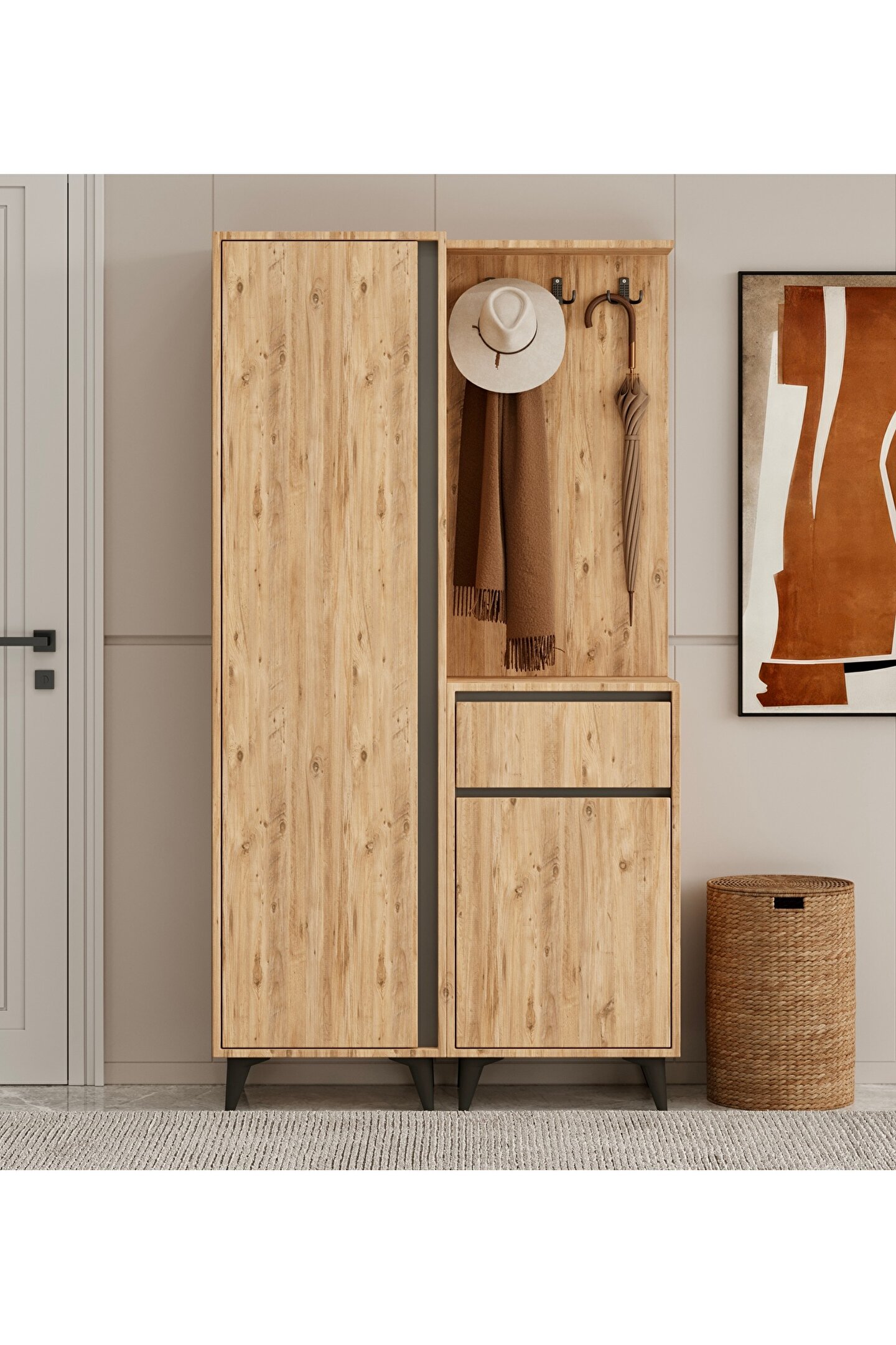 MYMOB USE PORTMANTO - Modern tasarımı ile evinizin dekorasyonuna şık bir dokunuş ekler.; - 1 yıl garanti süresiyle güvenilir kullanım sunar.; - 100 cm genişliği ve 35 cm derinliği, geniş depolama alanı sağlar ve düzenli bir görünüm kazandırır.; - Suntalam materyali sayesinde dayanıklılık ve uzun ömürlü kullanım vaat eder.; - 190 cm yüksekliği ile hem estetik hem de fonksiyonel bir yapıya sahiptir.; - Türkiye menşeli olmasıyla yerel üretimden yana tercih yapmanızı sağlar.;