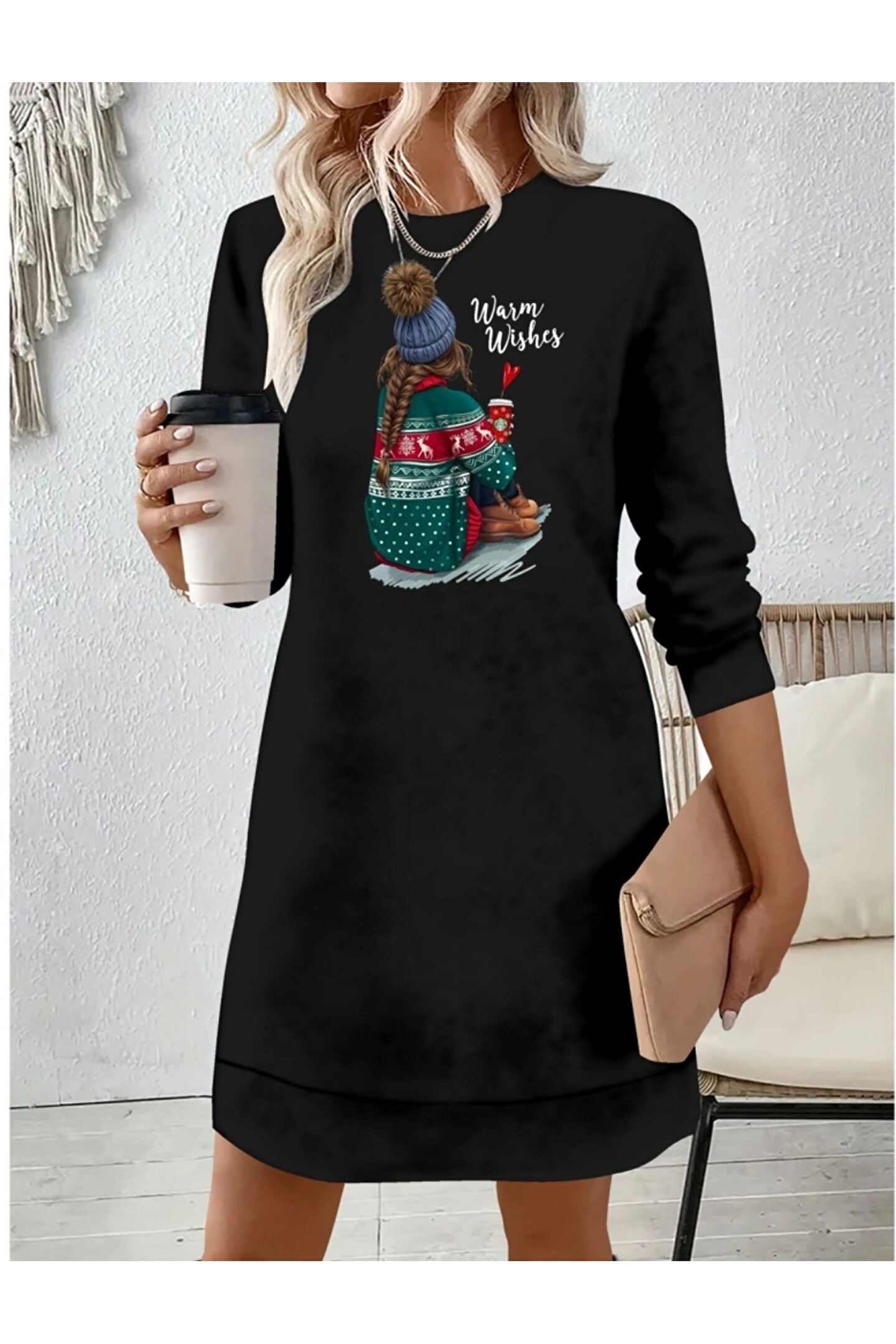 MyTerrax Kadın Uzun Kollu Bisiklet Yaka Desenli Viskon Iki Iplik Elbise