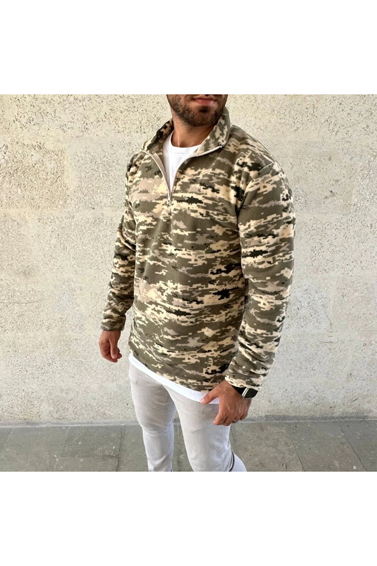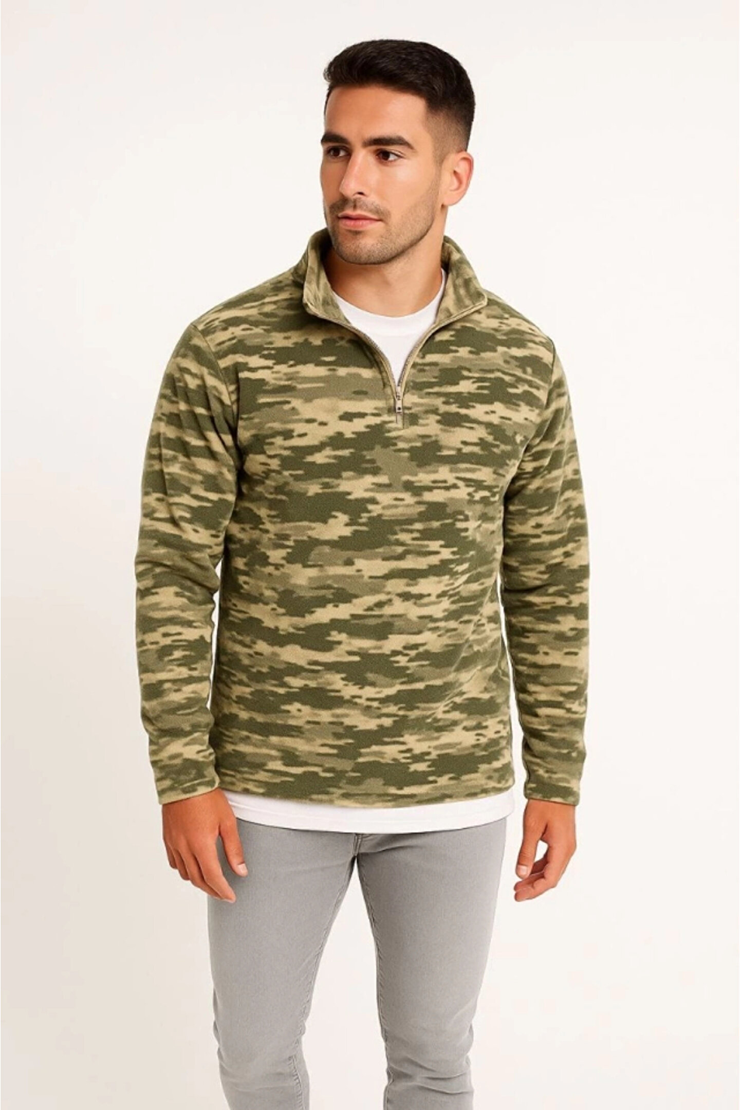 Erkek Yarım Fermuarlı Desenli Polar Sweat – Haki Kamuflaj Yakalı, Uzun Kollu, Oversize Rahat Kalıp - Haki