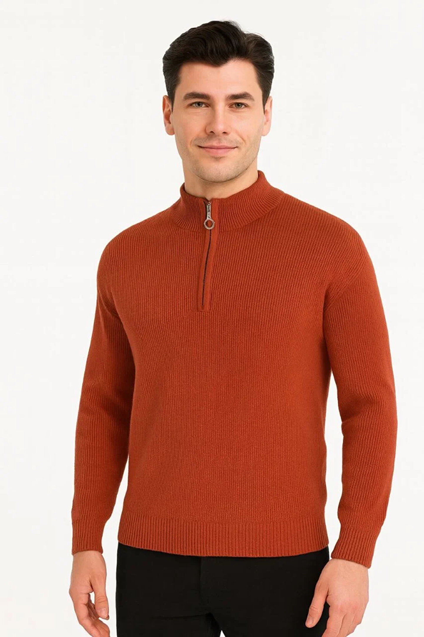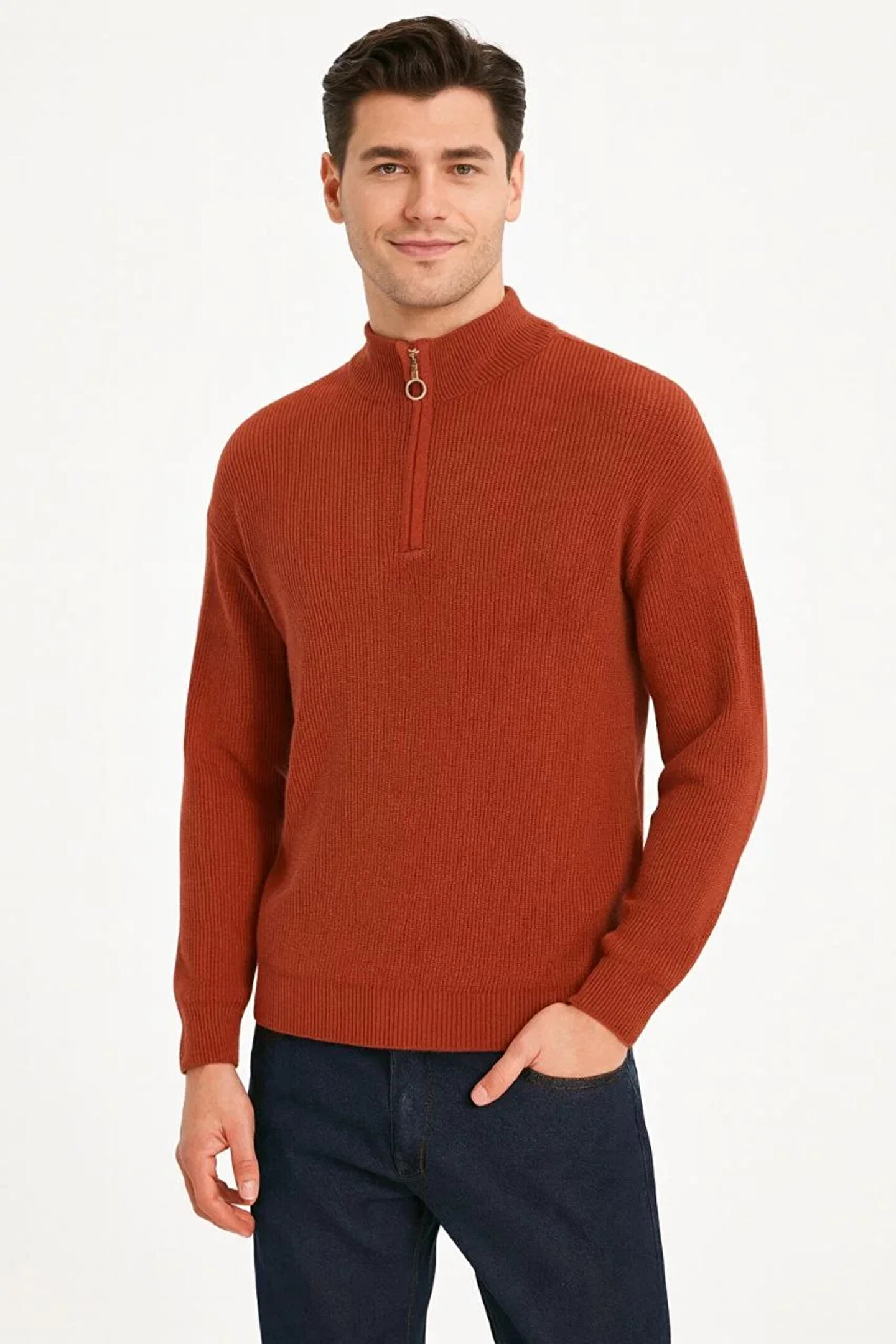 Erkek Yarım Fermuarlı Triko Kazak – Selanik Örgü, Dik Yaka, Pamuklu Dokuma, Regular Fit Uzun Kollu Kışlık Model - Kiremit