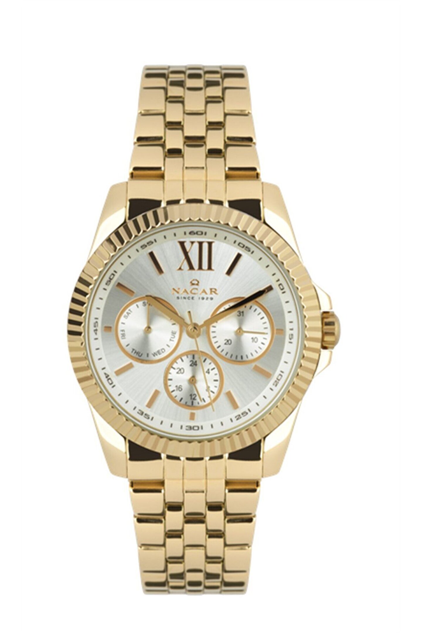 Markası: Nacar Cinsiyet: Bayan Kasa Cinsi: Çelik Kasa Rengi: Metal Kadran : Beyaz Kordon Cinsi: Çelik Kordon Rengi: Sarı Takvim: Var Gün Var Cam cinsi: Mineral Kronometre Yok Kasa Ebatı: 39mm Su Geçirmezlik 5atm
