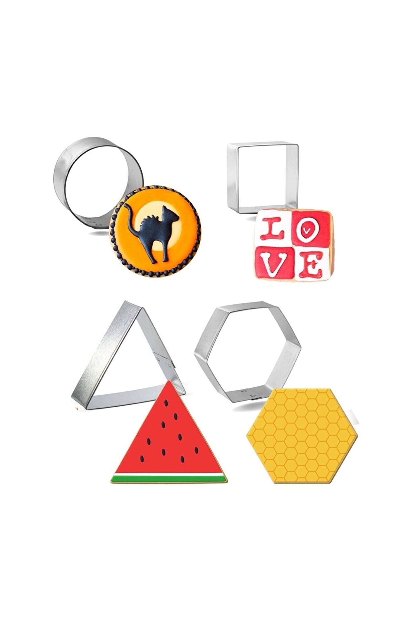 Dayanıklı çelik malzeme kullanılarak üretilmiş, uzun ömürlü ve sağlam bir yapıya sahip; Standart tasarımıyla her türlü pişirme kabı ile uyumlu, mutfakta kolayca kullanılabilir; Yuvarlak, kare, altıgen ve üçgen olmak üzere dört farklı şekliyle çeşitli kurabiye ve kek çeşitleri için ideal; 6 cm çapında geniş iç hacmi sayesinde büyük porsiyonlar için de uygundur;