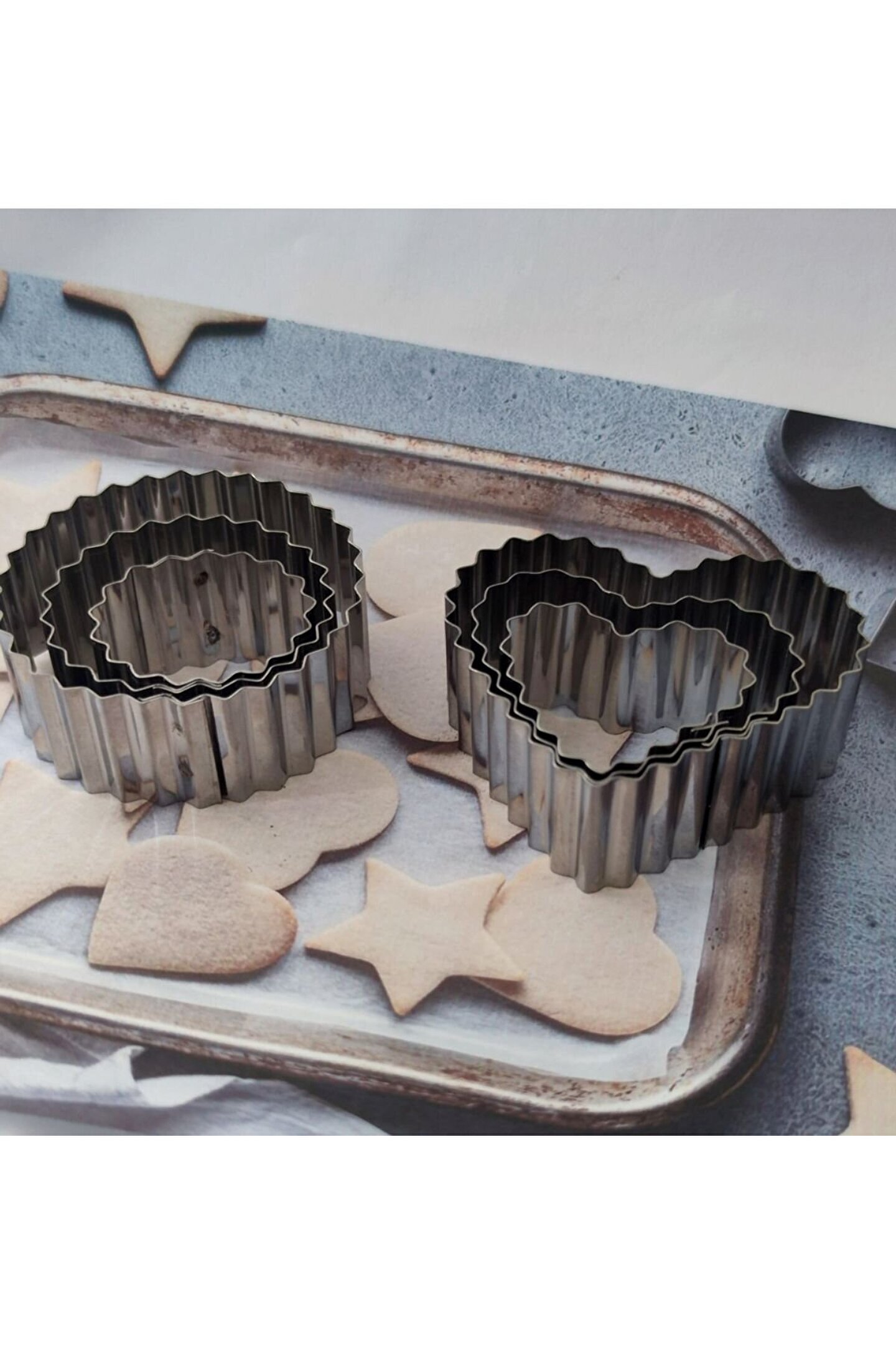 Standart tasarımıyla her ev mutfağına uyum sağlayan, şık ve modern görünümüyle dikkat çeken bu fırın ve kek kalıbı, mutfak dekorasyonunuzu tamamlıyor.; Paslanmaz çelik malzeme kullanımı sayesinde uzun ömürlü kullanım sunuyor, kolay temizlenebilir yapısıyla hijyenik pişirme deneyimi sağlıyor.; Kare ve yuvarlak tırtıklı şekilleriyle farklı ve estetik kurabiye çeşitleri hazırlayabileceğiniz bu set, her zaman lezzetli ikramların kapısını aralıyor.; Altı adet kalıp içeren bu set, birden fazla kurabiye çeşidi hazırlamak isteyenler için idealdir ve zaman kazandırarak mutfakta verimliliği artırır.; Standart boyutta olan bu fırın ve kek kalıbı, çeşitli fırın türleriyle uyumlu olmasıyla geniş kullanım alanına sahiptir; böylece farklı pişirme ihtiyaçlarınıza cevap verir.;