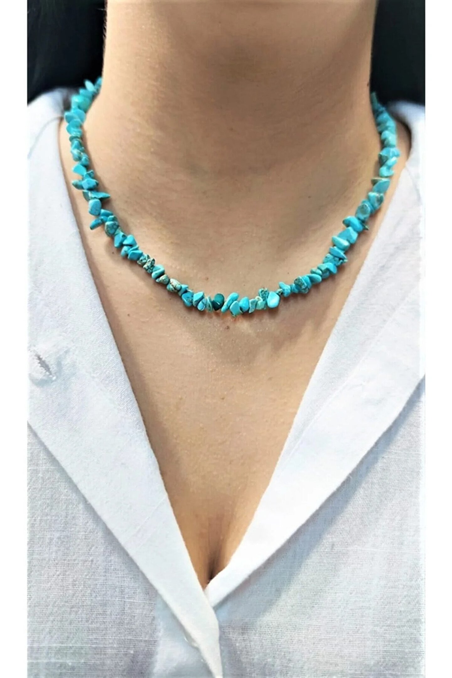 Doğal taş kullanımı sayesinde her kolye benzersiz ve otantik bir görünüm sunar; Turkuaz firuze ve kırıktaş gibi değerli taşlarla tasarlanmıştır, bu da kolyenin hem şık hem de göz alıcı olmasını sağlar; El işçiliği ile üretilmiş olup, her bir detayı özenle işlenmiştir ve bu da kolyenin kalitesini ve estetiğini artırır; Doğal taşların renk ve desen farklılıkları, her bir kolyenin eşsiz ve kişisel bir dokunuş kazanmasını sağlar;