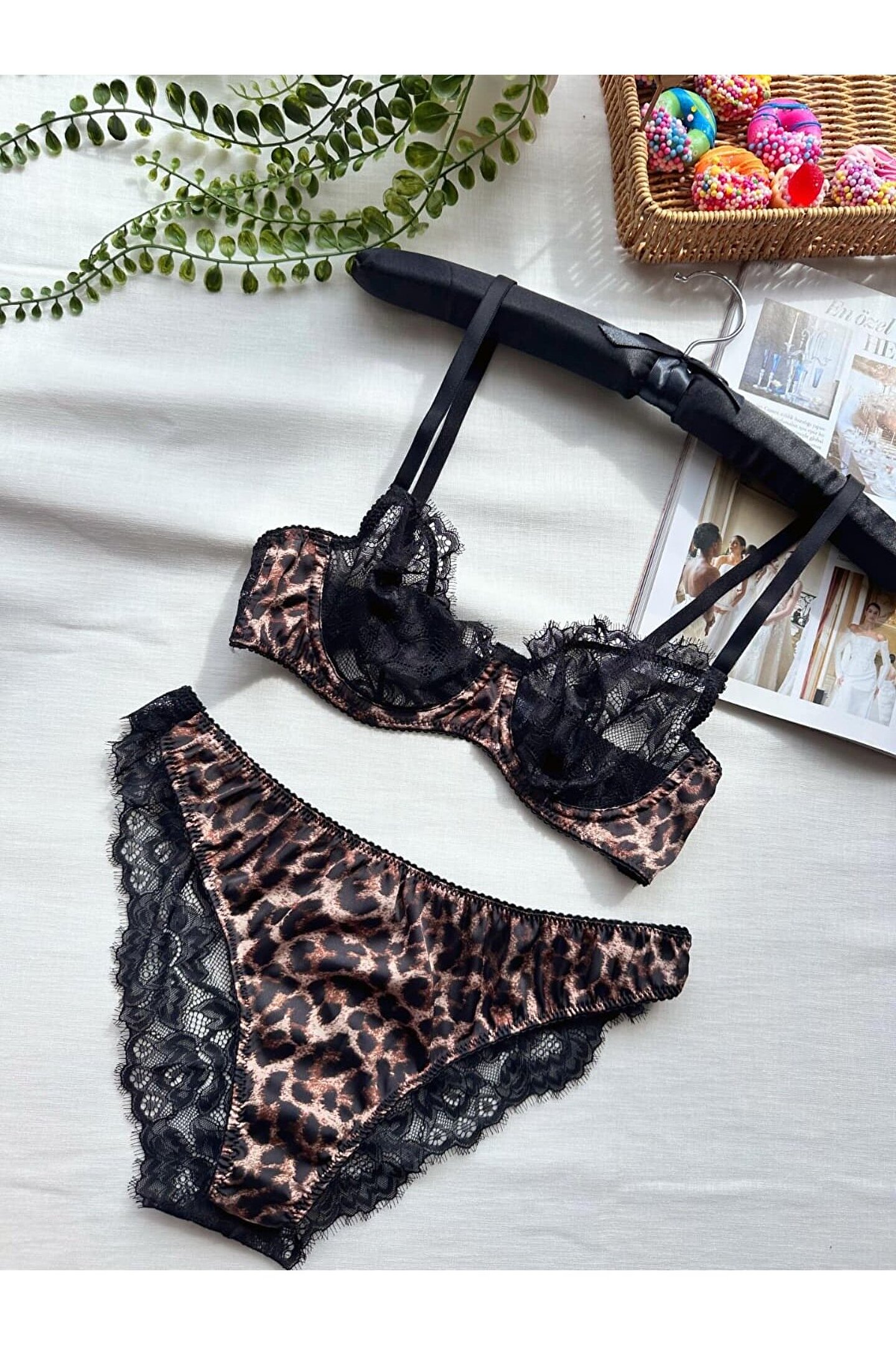 Vahşi şıklığın en zarif hâlini sunan leopar desenli saten ve siyah dantel detaylı takım, hem göz alıcı hem de feminen bir görünüm arayanlar için özel olarak tasarlandı.; ; Parlak saten dokusu teninizde kayarken, ince siyah dantel işlemeler takıma sofistike bir zarafet katar.; ; Yumuşacık yapısı ve esnek formu sayesinde vücuda mükemmel uyum sağlar; hem konforu hem estetiği bir arada sunar.; ; Özel geceler, kendinizi daha güçlü hissetmek istediğiniz anlar veya lüks bir günlük kullanım için ideal bir seçimdir.; ; Leopar desenli parlak saten kumaş ; Siyah dantel işlemeli zarif detaylar ; Rahat, esnek ve vücuda uyumlu form ; Yumuşak dokulu premium saten ; Feminen ve çekici tasarım ; Özel günlerde ve günlük şıklıkta kullanılabilir ;