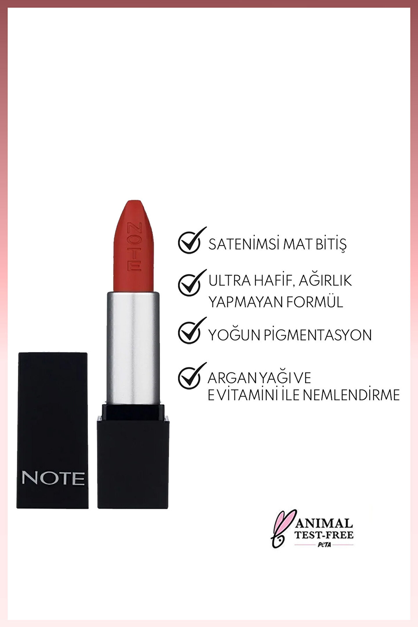 Tek sürüşte kusursuz mat görünüm sağlar.; Uzun süre kalıcıdır ve bulaşma yapmaz.; İçeriğindeki Argan Yağı ve E Vitamini ile dudaklarınızı nemlendirir ve pürüzsüz görünüm sağlar.; En güncel ürün bilgileri için lütfen satın aldığınız ürünün ambalajını kontrol ediniz.