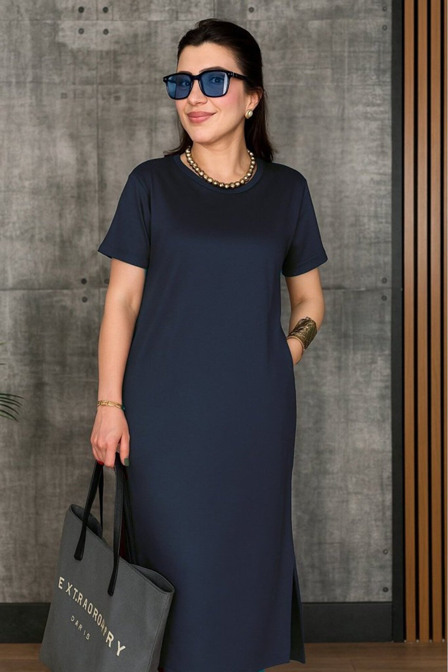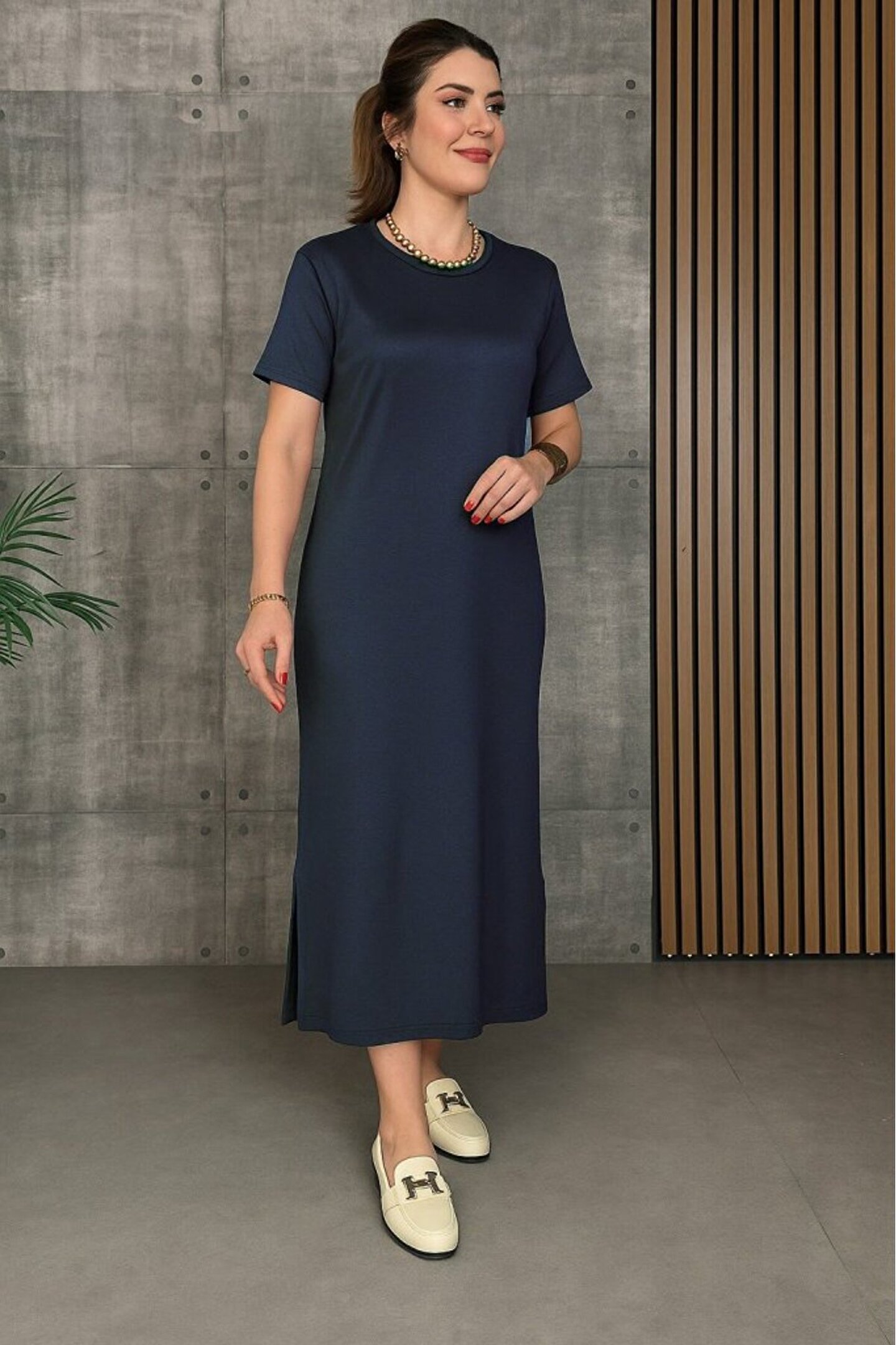 novafems EQURİ Kadın Kısa Kollu Bisiklet Yaka Yırtmaçlı Viskon Iki Iplik Elbise