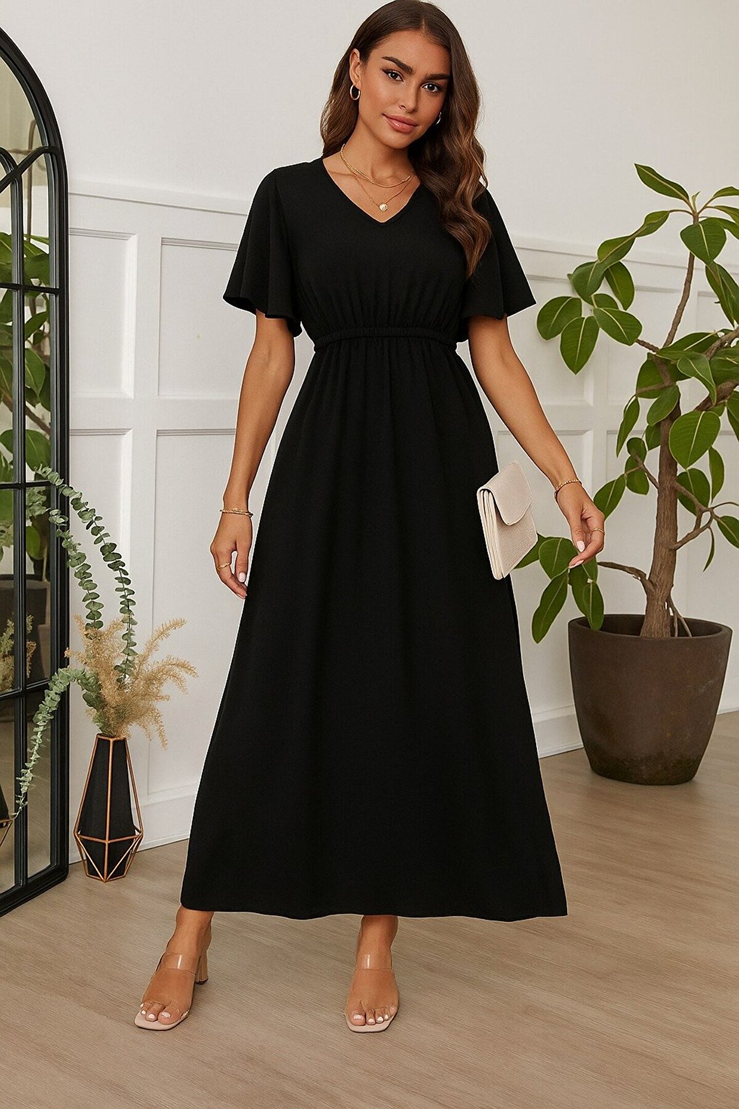 Kadın Kısa Kollu V Yakalı Beli Lastikli Uzun Viskon Elbise