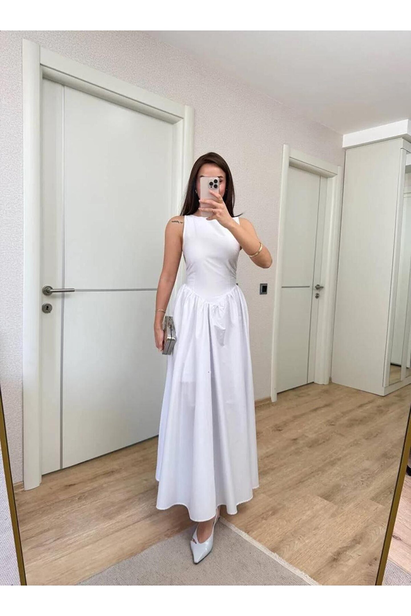 nscollection Sifir Kol Beli Oturtmalı Kolsuz Uzun Elbise - Beyaz