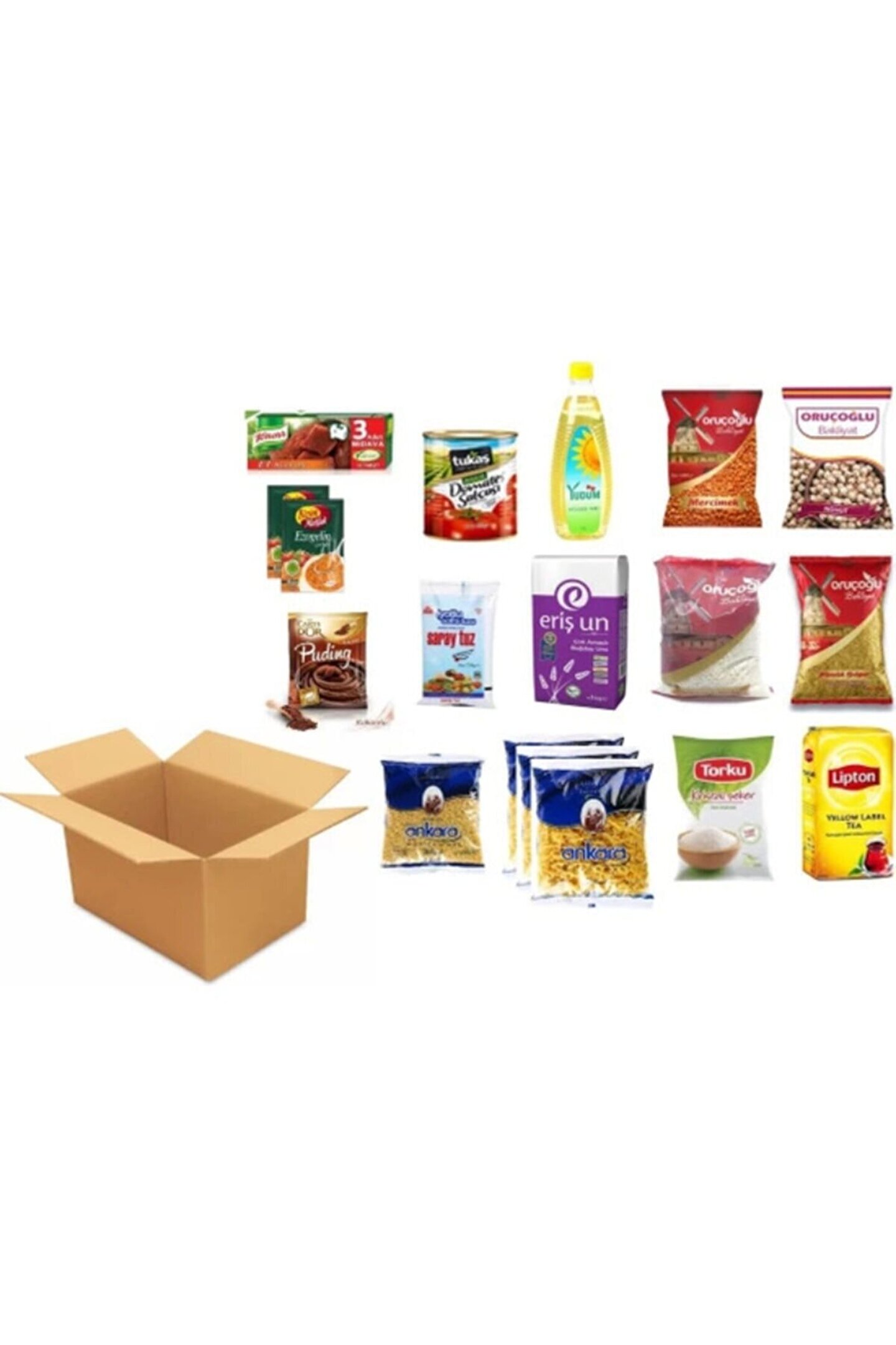 Ramazan Erzak Paketi 18 Parça Koli İçeriği: 1 Adet Yudum Ayçiçek Yağ 1 lt 1 Adet Çevik Osmancık Pirinç 1 kg 3 Adet Nuh'un Ankara Makarnası 500 gr 1 Adet Tatküpü Toz Şeker 1 kg 1 Adet Söke Un 1 kg 1 Adet Billur Tuz 750 gr 1 Adet Nuh'un Ankara Arpa Şehriye 500 gr 1 Adet Çevik Bulgur 1 kg 1 Adet Tamek Salça 830 gr 1 Adet Knorr Mutfak Et Bulyon 12 li 2 Adet Knorr Mutfak Hazır Çorba 1 Adet Çevik Kırmızı Mercimek 1 kg1 1 Adet Çevik Nahut 1 kg 1 Adet ÇAYKUR Çay 500 gr 1 Adet Pakmaya Puding;
