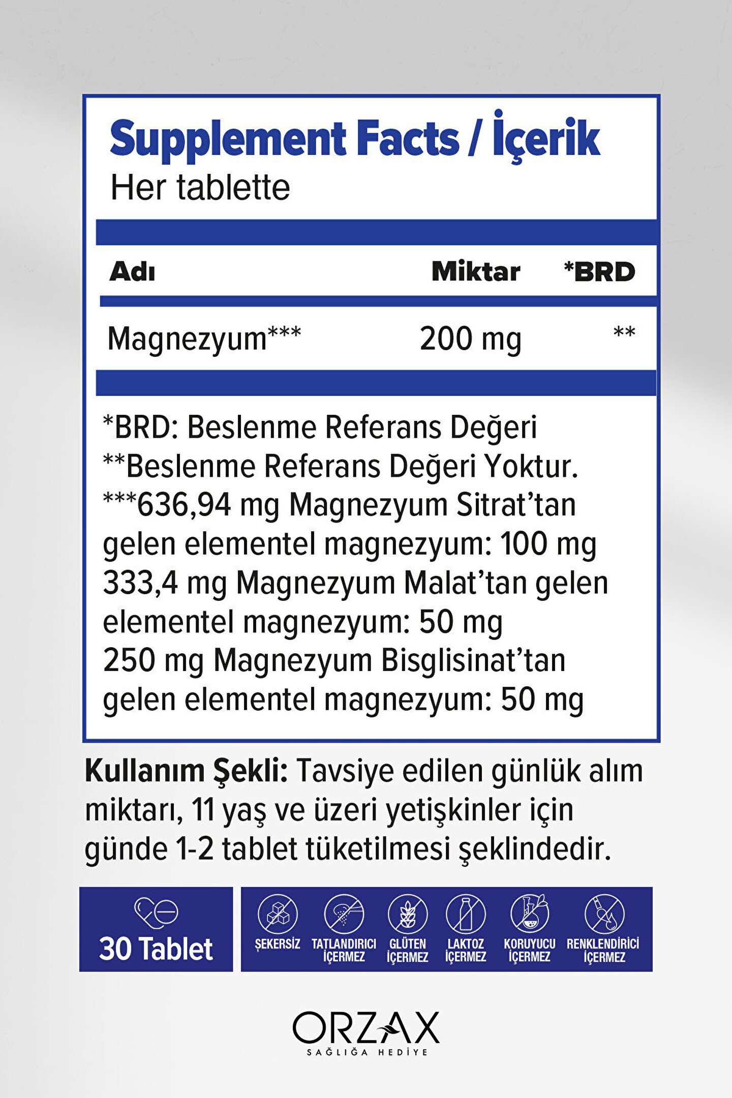 Ocean Extramag 30 Tablet İçerik Bilgisi (Her Tablette) Adı Miktarı; BRD Magnezyum; 200 mg %53; BRD: Beslenme referans değeridir; 636; 94 mg Magnezyum Sitrat'tan gelenelementel magnezyum:100 mg333,4 mg Magnezyum Malat'tan gelenelementel magnezyum: 50 mg250 mg Magnezyum Bisglisinat'tan gelenelementel magnezyum: 50 mg;