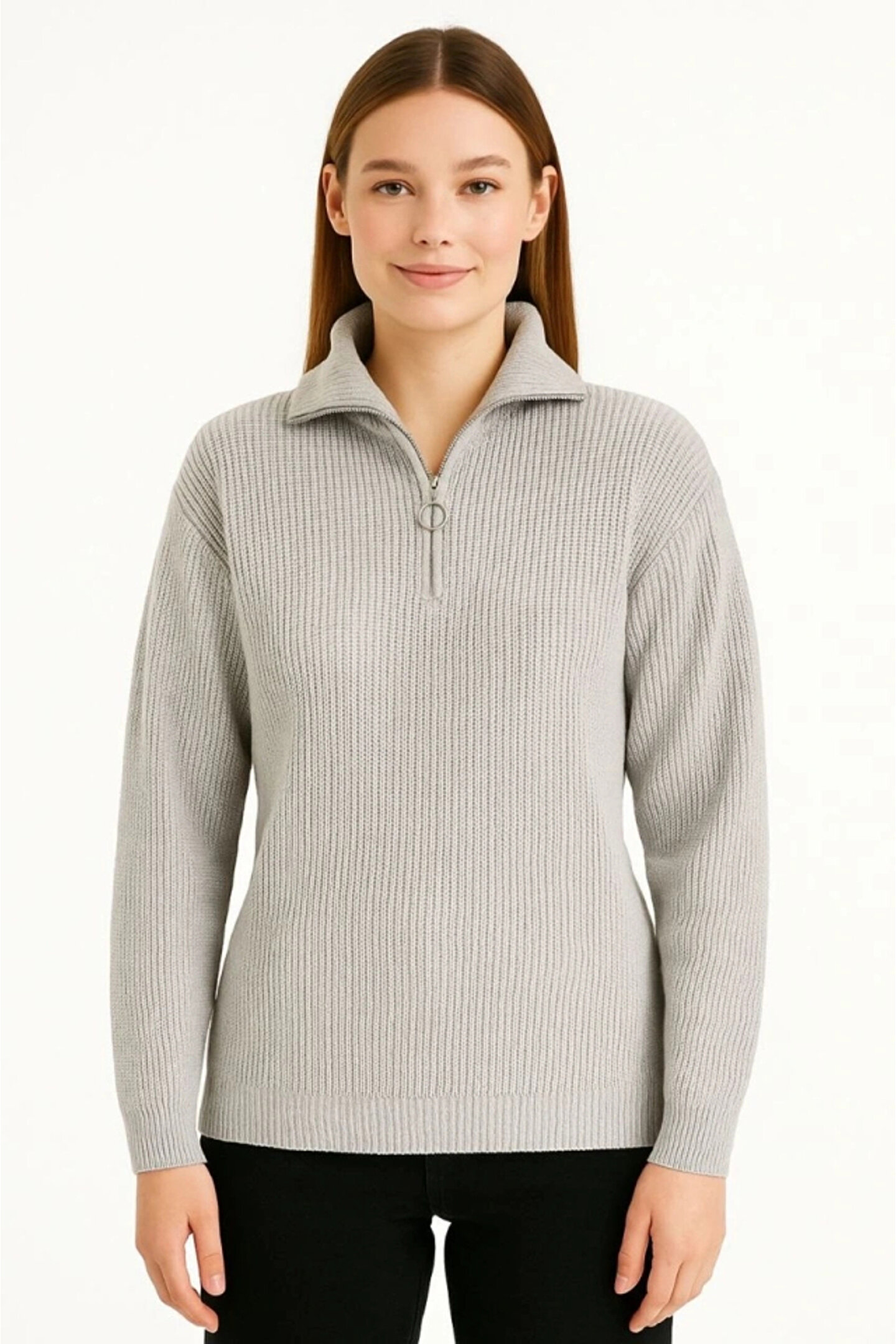 KADIN Yarım Fermuarlı Triko Kazak – Selanik Örgü, Dik Yaka, Pamuklu Dokuma, Regular Fit Uzun Kollu Kışlık Model - Gri