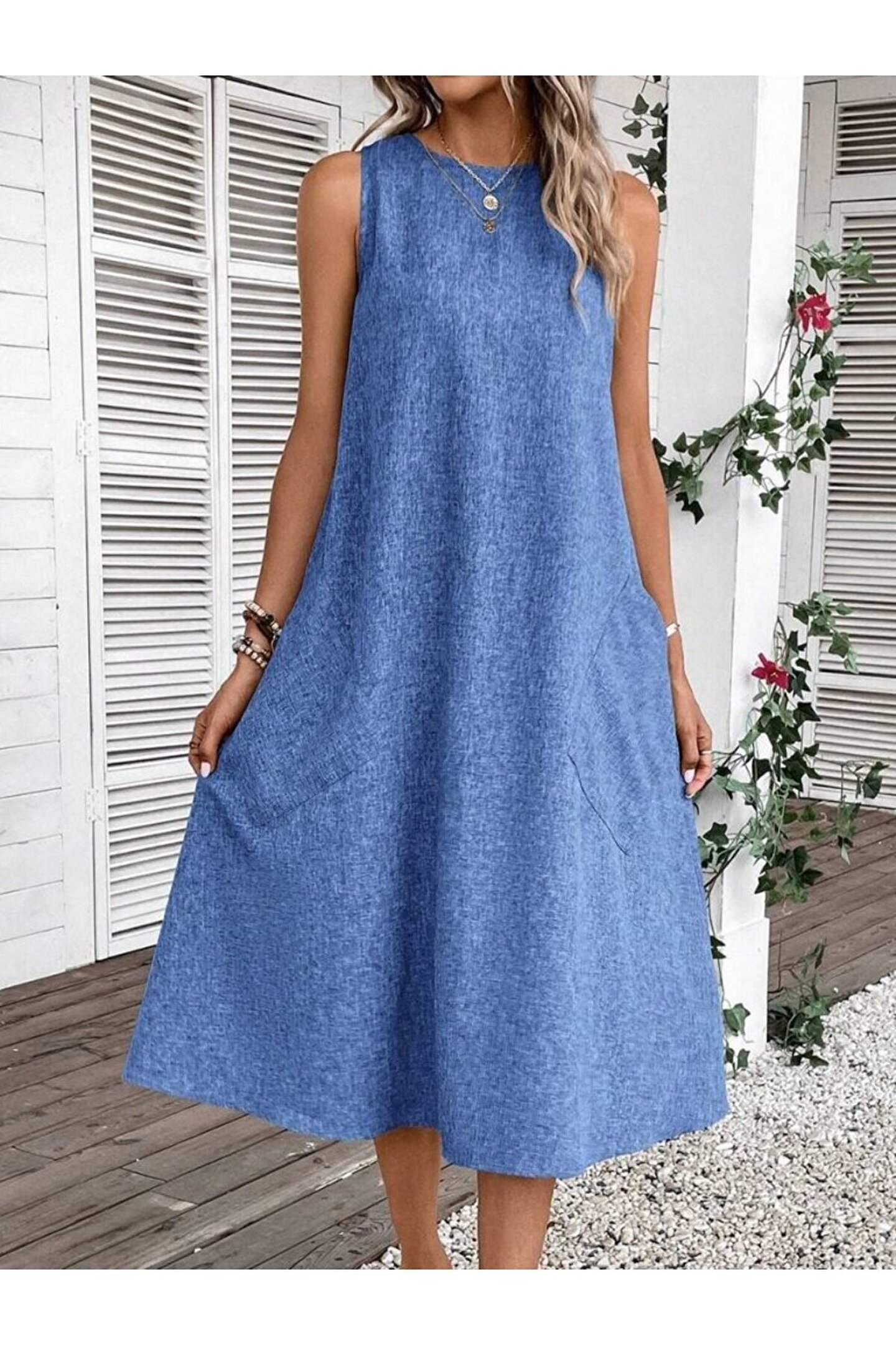 Kadın Kolsuz Bisiklet Yaka Cepli Midi Keten Elbise