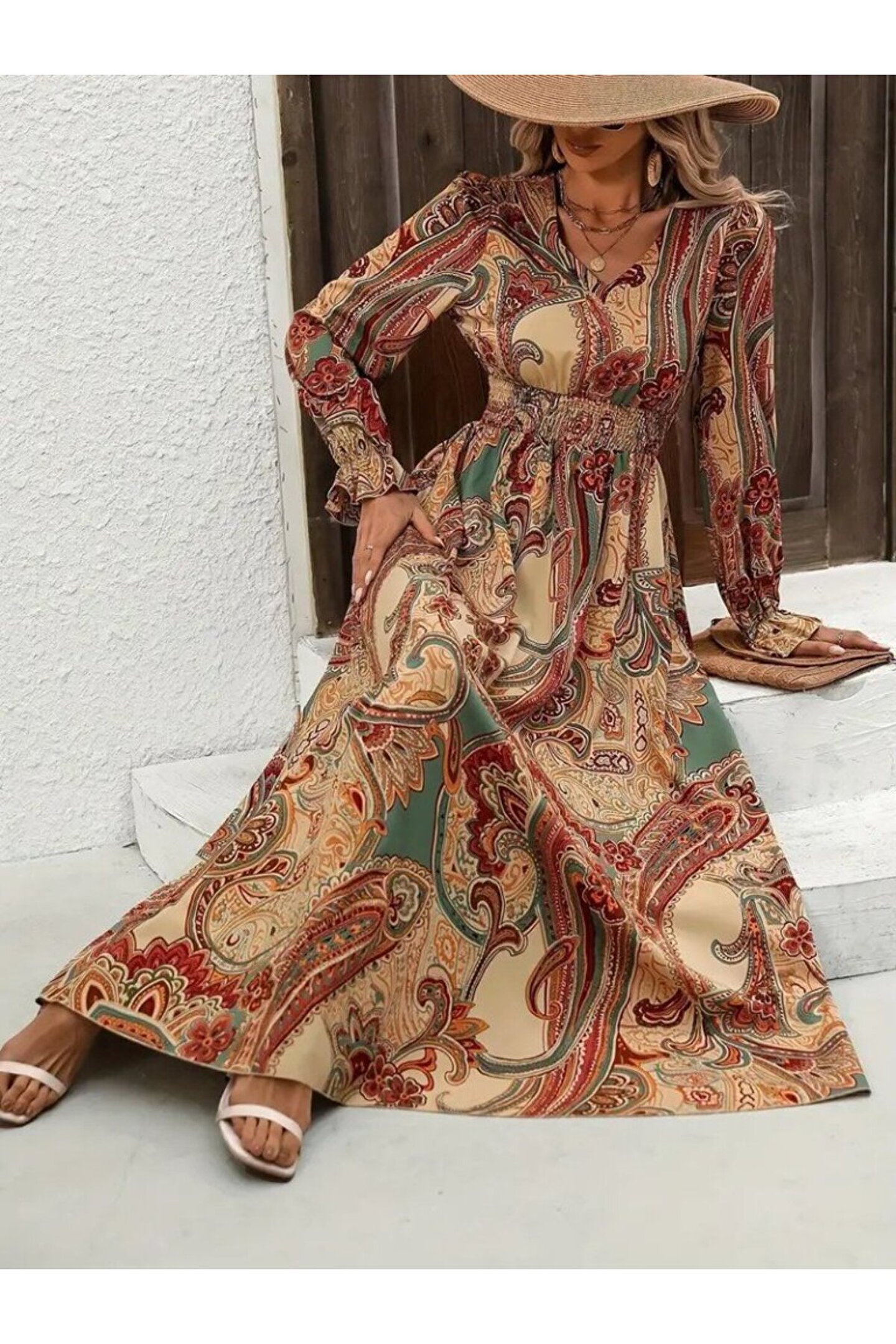 Omarı EQURİ Kadın Uzun Kollu V Yakalı Beli Lastikli Desenli Süprem Elbise