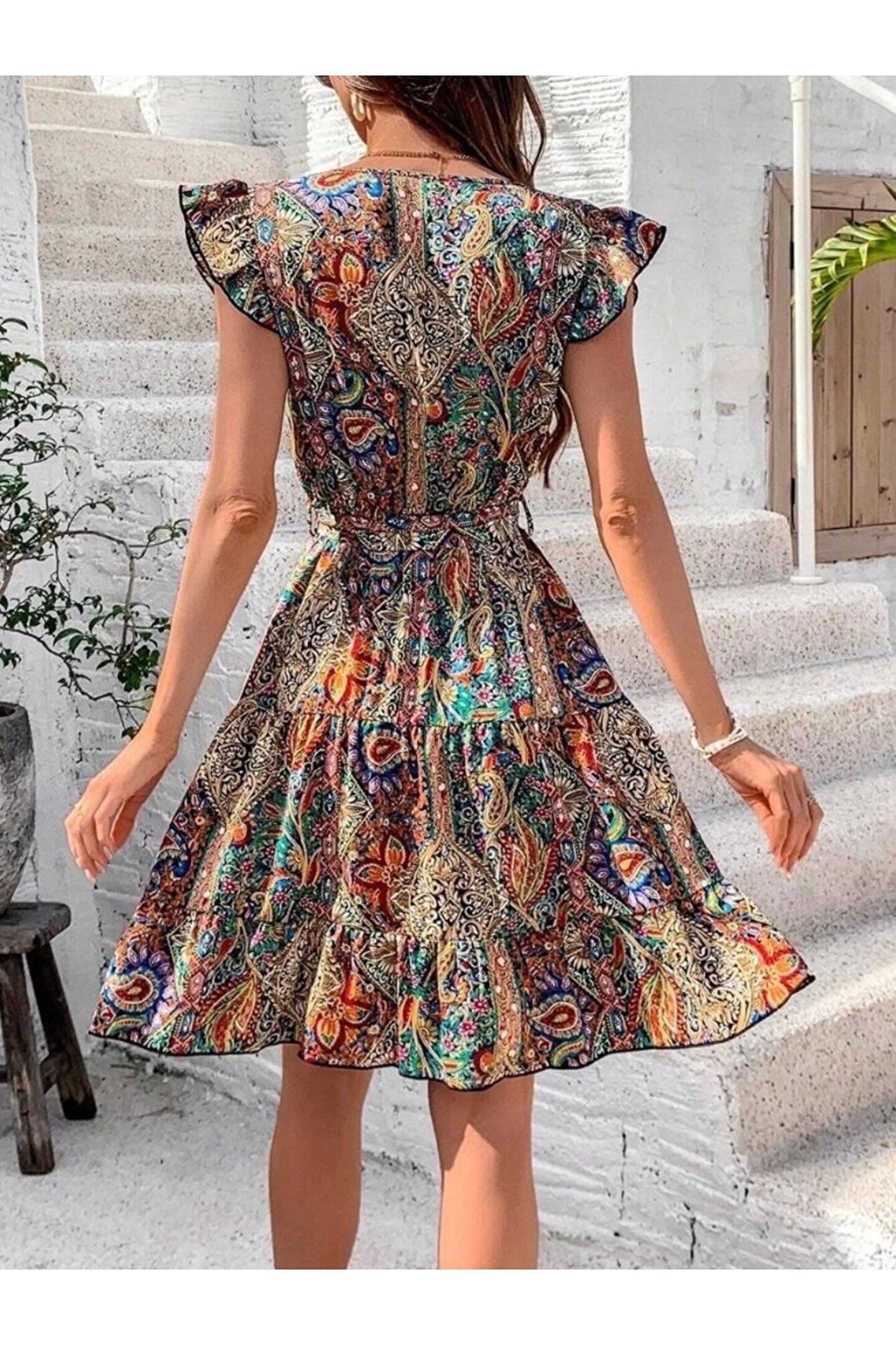 Omarı Kadın Kısa Kelebek Kollu Kruvaze Yakalı Süprem Elbise