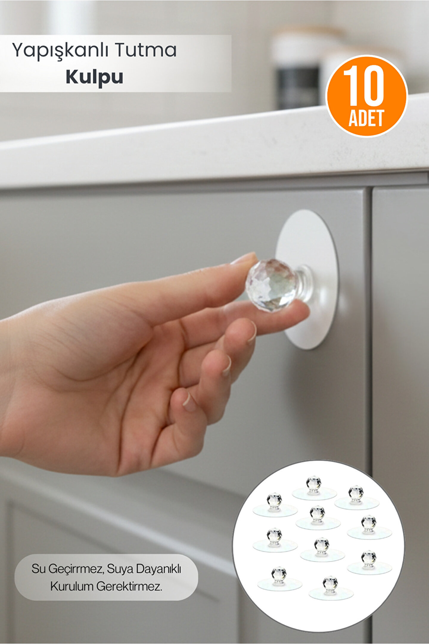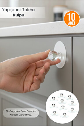 Yapışkanlı tutma kulpu; güçlü vakumlu yapışma yüzeyi sayesinde dolap kapağı, çekmece, klozet kapağı, buzdolabı rafı gibi tüm düz yüzeylerde pratik kullanım sağlar; kristal görünümlü şeffaf tutma başlığı ile modern ve estetik bir görünüm sunar; kurulum gerektirmez, delme–vidalama ihtiyacını ortadan kaldırır; su geçirmez ve neme dayanıklı yapısı sayesinde banyo, mutfak ve balkon gibi ıslak alanlarda güvenle kullanılabilir; düşmeyen sağlam tutuşu ile kapağı kolayca açmanızı sağlar; plastik ve cam yüzeylerde iz bırakmaz, yüzeyi çizmeyen tasarım sunar; çocuklar ve yaşlılar için kullanımı kolaydır; taşınabilir yapısı sayesinde istediğiniz yere saniyeler içinde uygulanır; hijyenik ve uzun ömürlü malzemeden üretilmiştir; ev, ofis, karavan ve öğrenci yurdu gibi her yaşam alanında kullanım için idealdir; 10’lu ekonomik set içeriğiyle çoklu kullanım imkânı sağlar; gardırop, mutfak dolabı, banyo dolabı, yatak odası çekmeceleri ve klozet kapağı gibi alanlarda yüksek pratiklik sunar.; 10 adet Ölçüsü Çap 5,5 cm Yükseklik 2,5 cm dir.;