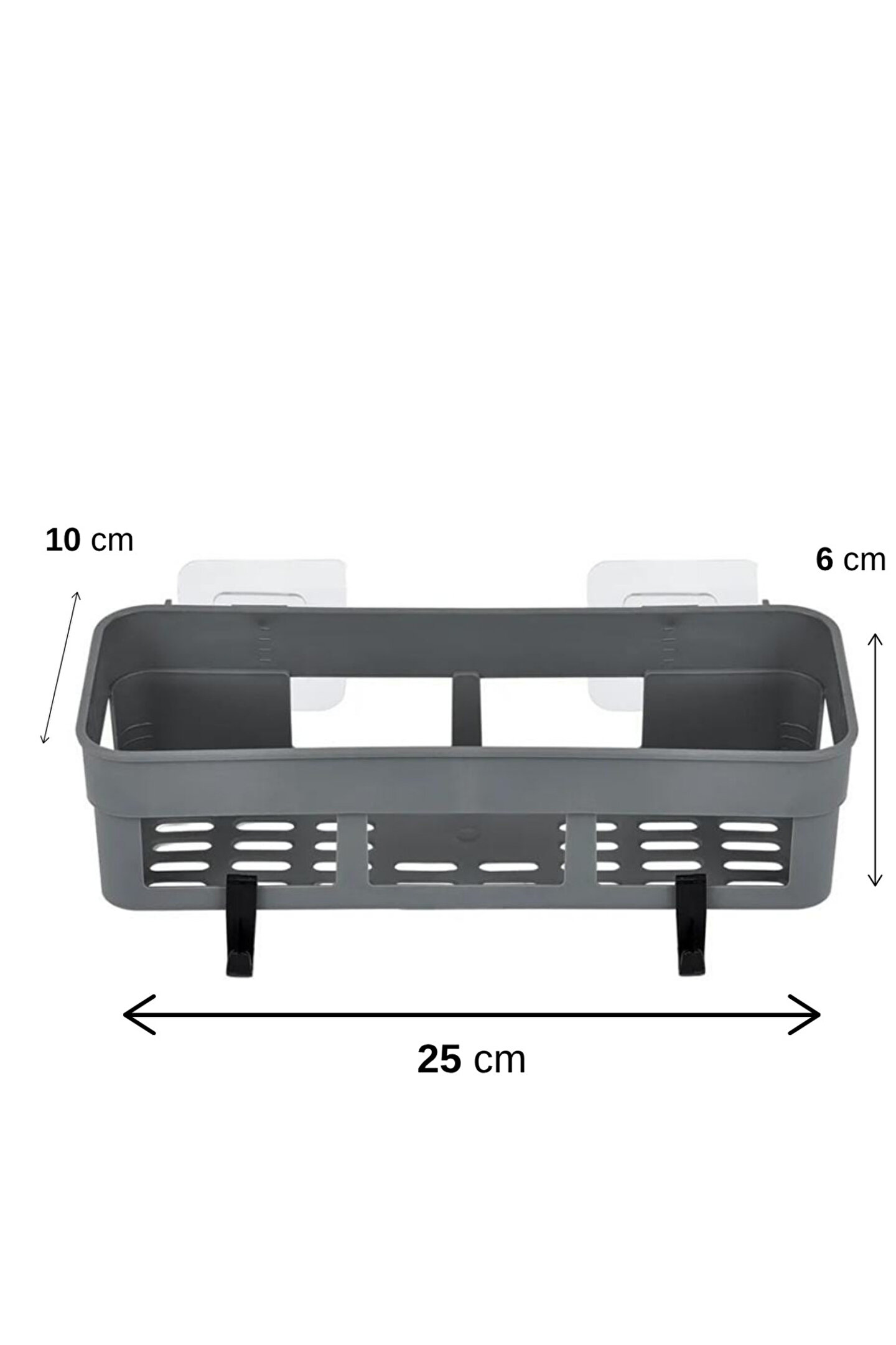 Bu şık ve kullanışlı plastik yapışkanlı duvar rafı, hem banyo hem mutfak kullanımına uygun pratik bir depolama çözümüdür.; Delme gerektirmeyen güçlü yapışkan sistemi sayesinde duvarınıza zarar vermeden kolayca monte edilir.; Suya ve neme dayanıklı sağlam plastik malzemesiyle uzun ömürlü kullanım sağlar.; Geniş iç hacmiyle şampuan, duş jeli, diş fırçası, losyon veya mutfakta baharat şişeleri, temizlik malzemeleri gibi birçok ürünü düzenli şekilde tutar.; Alt kısmındaki askı kancaları, el bezi, sünger veya banyo lifi gibi eşyaları asmak için idealdir.;