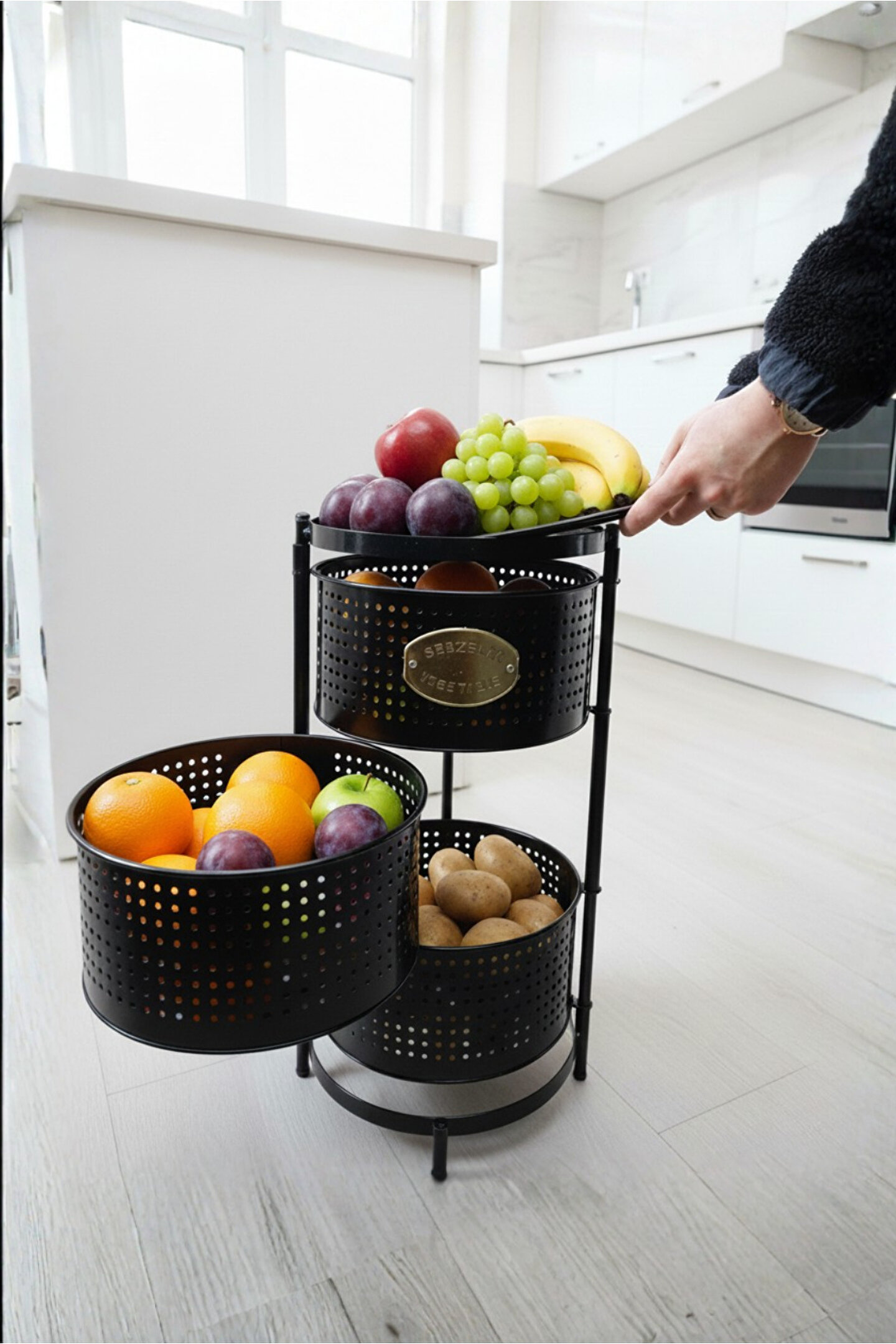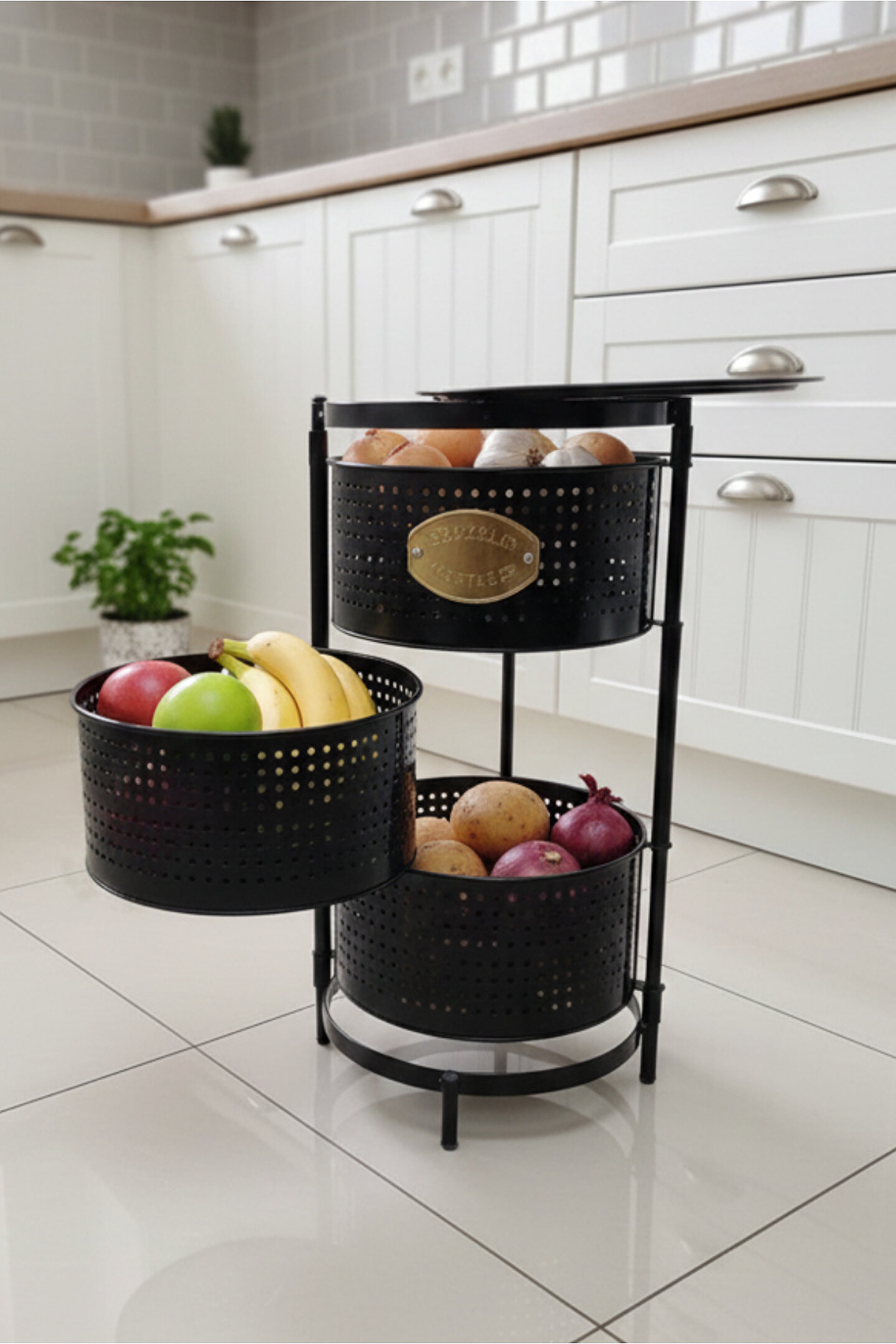 Ölçüler: Sepetler : 30x30 Cm; Sepet Yüksekliği : 13 cm ; Toplam Yükseklik : Yükseklik : 62 cm; Mutfak tezgâhında ya da evinizin başka alanlarında ekstra depolama alanına ihtiyaç duyanlar.; Sebze ve meyvelerini düzenli şekilde saklamak isteyenler.; Evleri küçük olan, alanı verimli kullanmak isteyenler.; Kolayca hareket ettirip gerektiğinde sabitlemek isteyen kullanıcılar.;