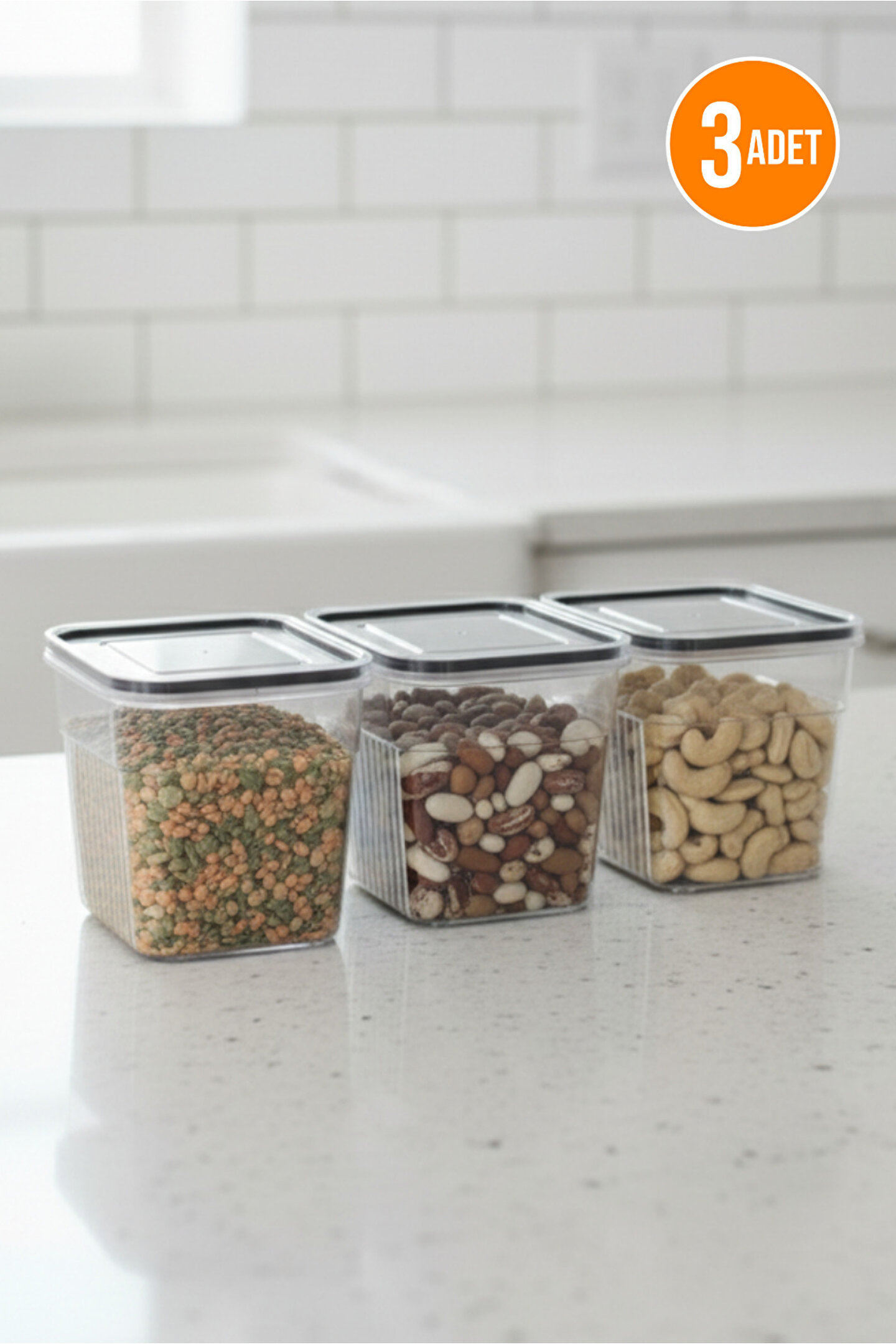 Modern mutfaklar için ideal çözüm olan şeffaf kapaklı saklama kutusu seti; kuru gıdaları, bakliyatları ve atıştırmalıkları düzenli ve hijyenik şekilde saklamanıza yardımcı olur; BPA içermeyen yüksek kaliteli plastikten üretilmiştir; hava geçirmez kapak yapısı sayesinde gıdaların tazeliğini uzun süre korur; şeffaf gövde tasarımı ile içeriği kolayca görebilir, mutfakta zamandan tasarruf edebilirsiniz; fasulye, mercimek, nohut, fındık, badem, kaju, kuru meyve gibi pek çok ürünü saklamaya uygundur; minimalist tasarımı sayesinde mutfak tezgahında, dolapta veya buzdolabında estetik bir görünüm sağlar; istiflenebilir yapısı sayesinde yerden tasarruf ettirir; kolay temizlenebilir ve bulaşık makinesinde yıkanabilir; dayanıklı ve uzun ömürlü malzemesi ile mutfağınızda düzen ve şıklığı bir arada sunar.;