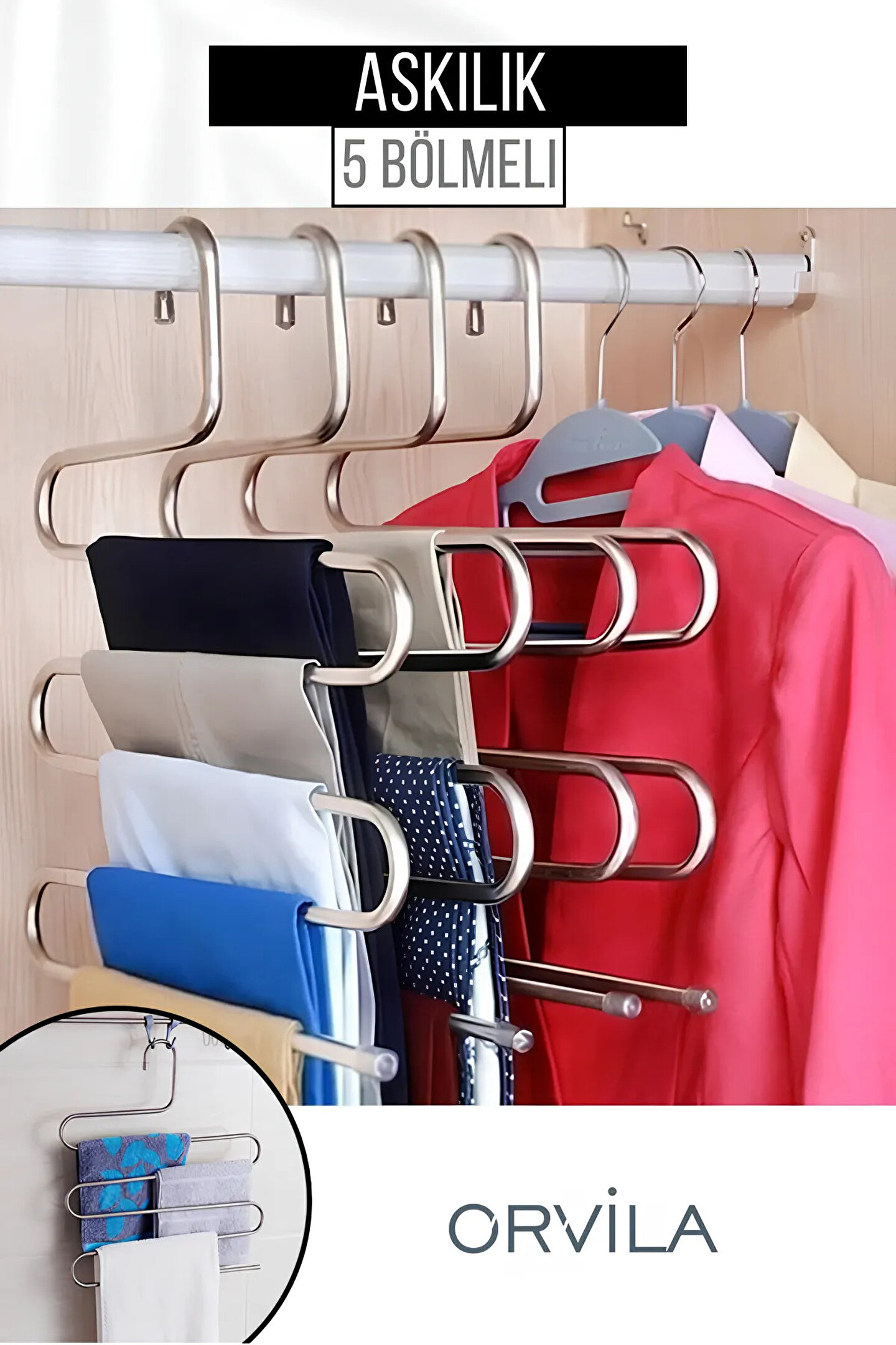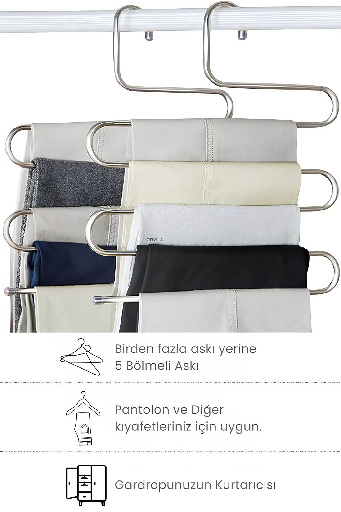 Paslanmaz metal malzemesi ile uzun ömürlü kullanım sunan bu askı, elbiselerinizden pantolonlarınıza, eşarplarınızdan fularlarınıza kadar geniş bir kullanım yelpazesi vaat ediyor.; ;