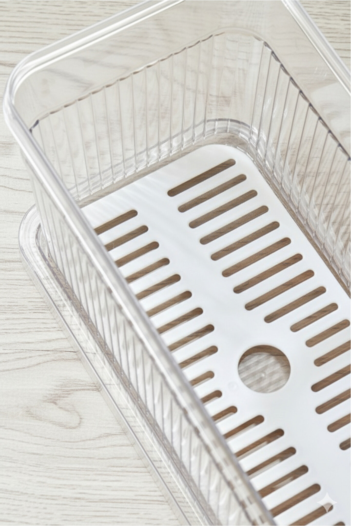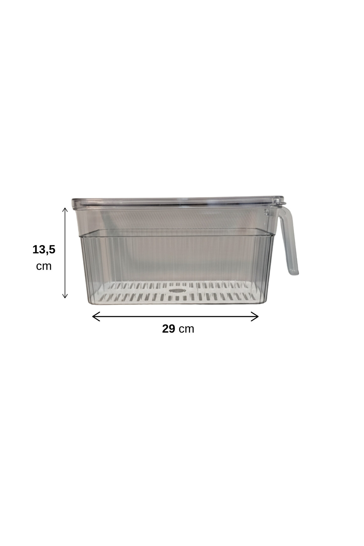 Şeffaf kapaklı buzdolabı düzenleyici saklama kutusu; meyve ve sebzeleri daha uzun süre taze tutan havalandırmalı tasarım; buzdolabı içi düzeni artıran modüler yapı; BPA içermeyen yüksek kaliteli sağlam plastik; kolay çekilip çıkarılabilen ergonomik kulp; üst üste dizilebilir alan tasarrufu sağlayan gövde yapısı; koku ve leke tutmayan hijyenik yüzey; tüm içerikleri tek bakışta görmeyi sağlayan tamamen şeffaf tasarım; sebze, meyve, yeşillik, kahvaltılık ve atıştırmalık saklamaya uygun geniş kullanım alanı; buzdolabı, derin dondurucu ve kiler için ideal organizer çözümü; dayanıklı, kırılmaya dirençli uzun ömürlü malzeme; temizlemesi kolay elde yıkamaya uygun; mutfak içi düzeni profesyonel seviyede artıran pratik saklama kabı.; Ölçüsü 29x13,5 yükseklik 13,5 cm