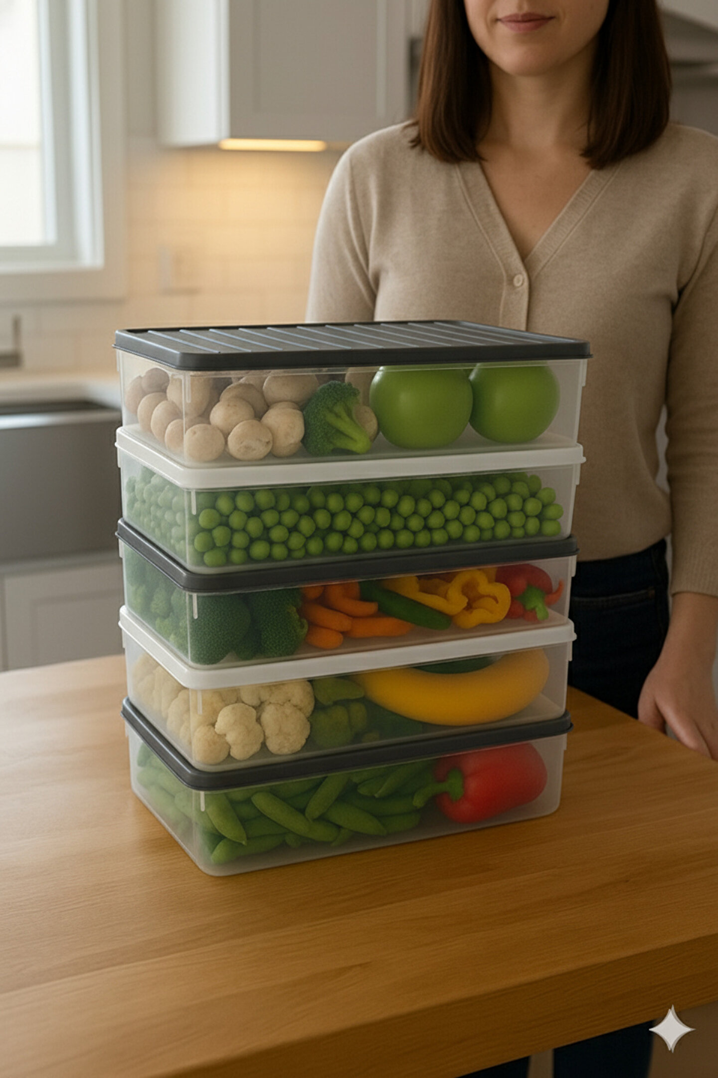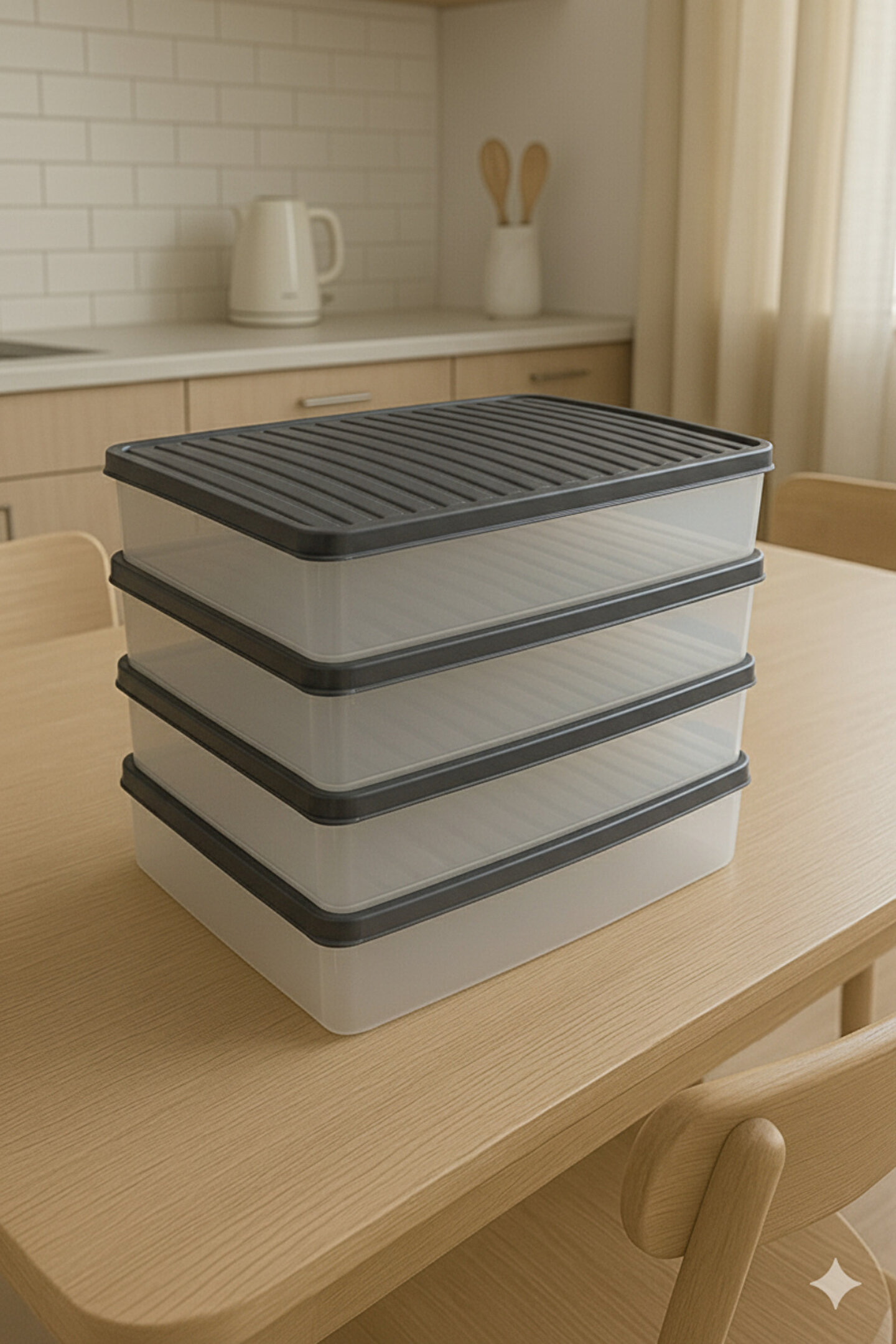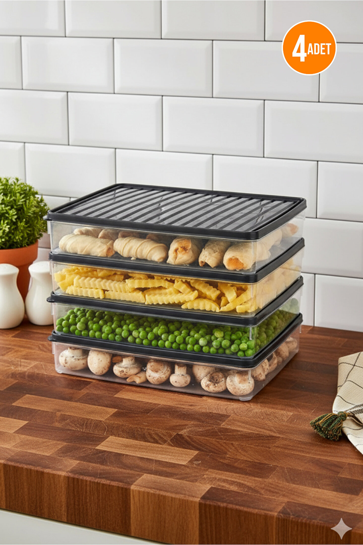 Şeffaf Gıda Saklama ve Buzdolabı Düzenleme Kutusu – 4’lü Set; Buzdolabı düzenini korumanıza ve gıdalarınızı uzun süre taze tutmanıza yardımcı olur; Şeffaf gövdesi sayesinde içindekileri kolayca görebilir, aradığınız ürünü zahmetsizce bulabilirsiniz; Hava geçirmez kapak yapısı, meyve, sebze, kahvaltılık ve yemek artıkları gibi gıdaların tazeliğini korur; İstiflenebilir tasarımı sayesinde buzdolabında maksimum alan tasarrufu sağlar; Dayanıklı, BPA içermeyen, sağlığa zararsız plastikten üretilmiştir; Kolay temizlenebilir yapısı ile hem elde hem de bulaşık makinesinde yıkanabilir; Sebze, meyve, kahvaltılık, sos, çerez veya yemek saklama amacıyla çok yönlü kullanım sunar; Modern gri kapak detayıyla mutfak estetiğine uyum sağlar; Ev, ofis, piknik veya kamp kullanımı için idealdir; Dondurucuya ve buzdolabına uygundur; Pratik, hijyenik ve düzenli bir saklama çözümü arayanlar için mükemmel bir seçenektir.; Ölçüsü 27,5x22 cm dir.;