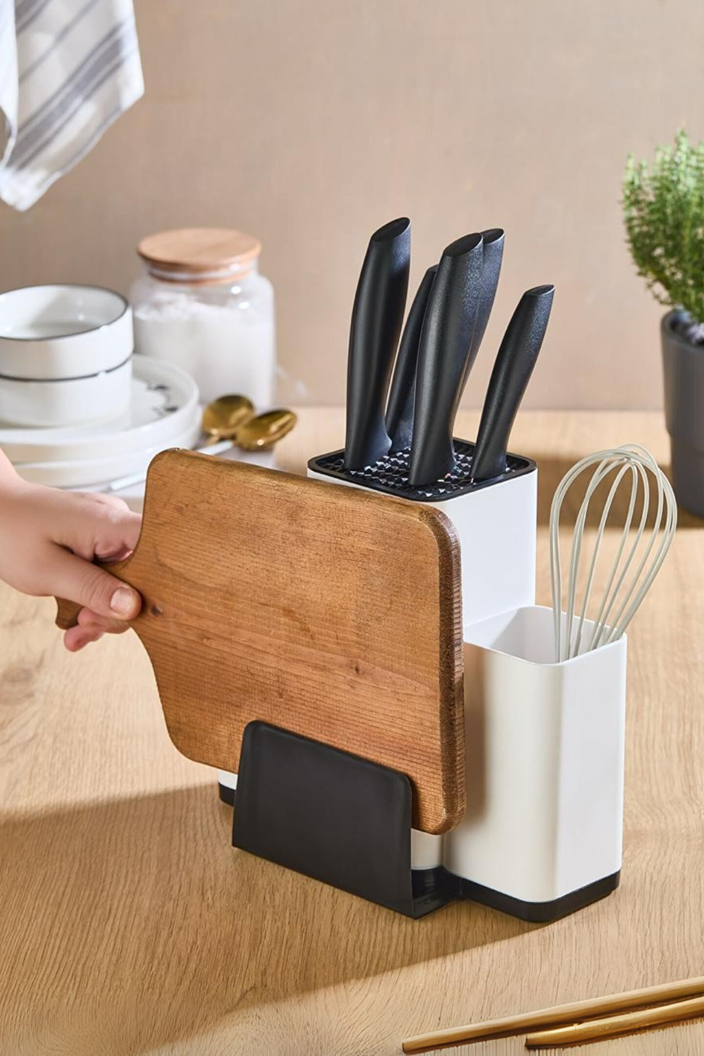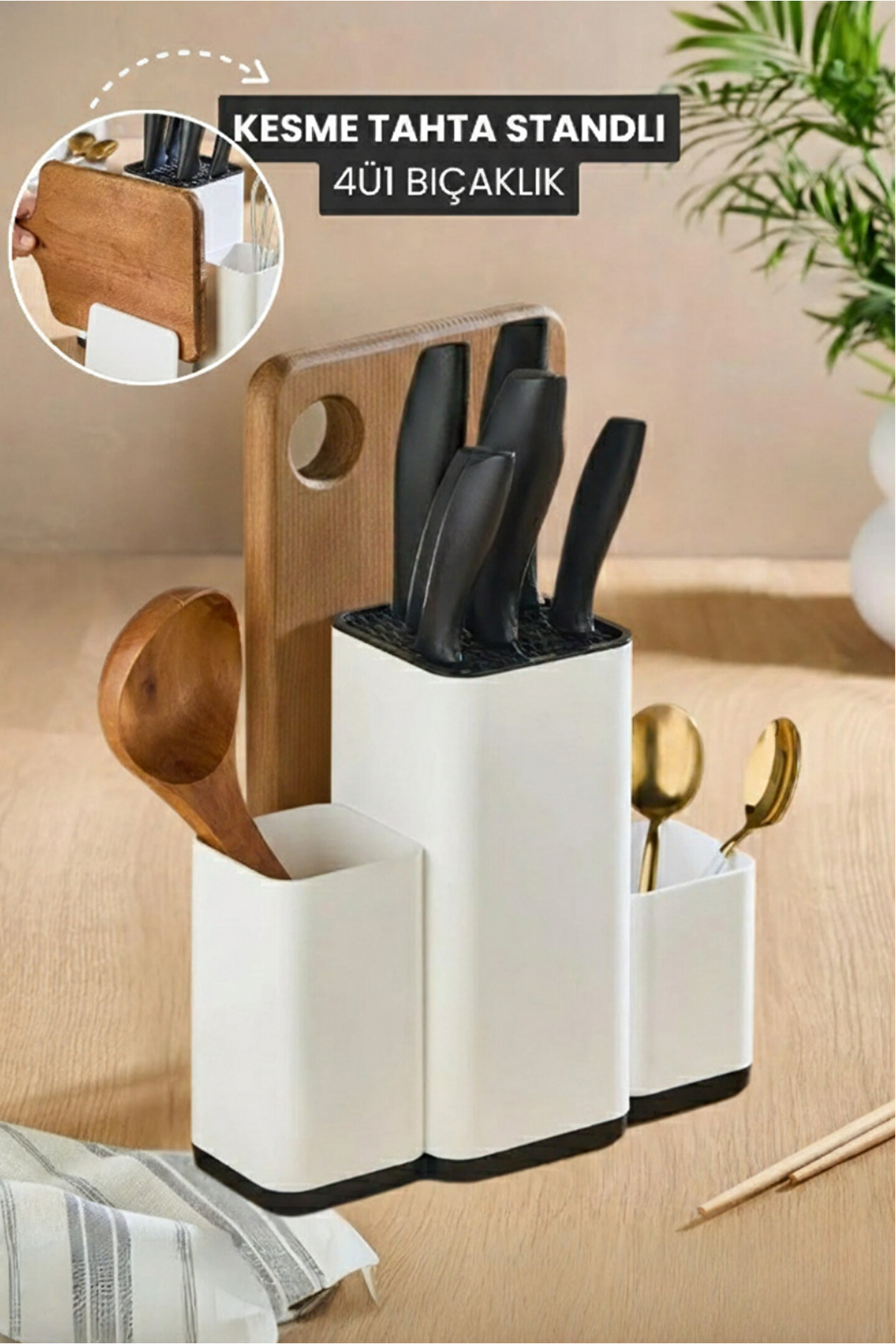 Orvila 4Ü1 Bıçaklık Kaşıklık Kesme Tahta Standlı Mutfak Tezgah Üstü Dik Düzenleyici Beyaz