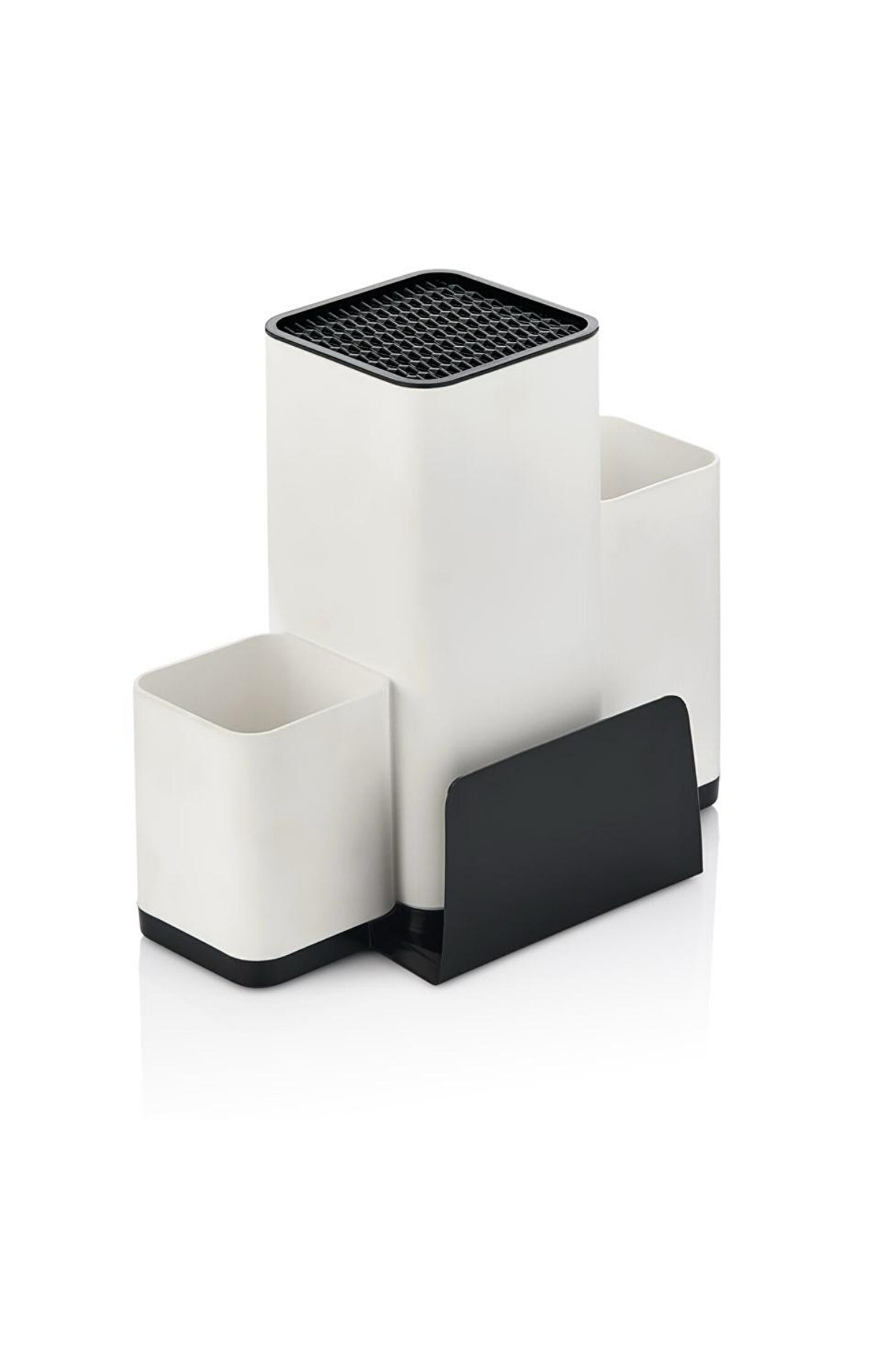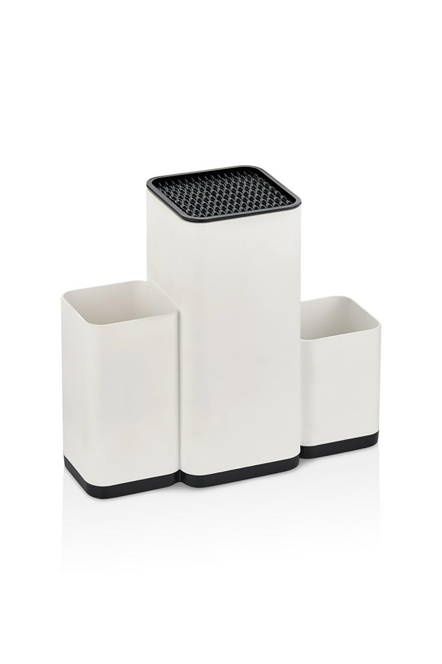 - 4 bölümden oluştur. Izgaralı orta kısımda bıçaklar makaslar gibi kesici mutfak gereçlerinize özel tam geçmeli yapıdadır. Birbirine çarpmayan bıçaklarınız bu sayede çizilmez ve körelmez. Yan bölümlere kepçe, kaşık, mini rende, çırpıcı, spatula gibi gereçleri düzenler. Arka kısım metal, ahşap veya cam farketmeksizin kesim panolarınız içindir.