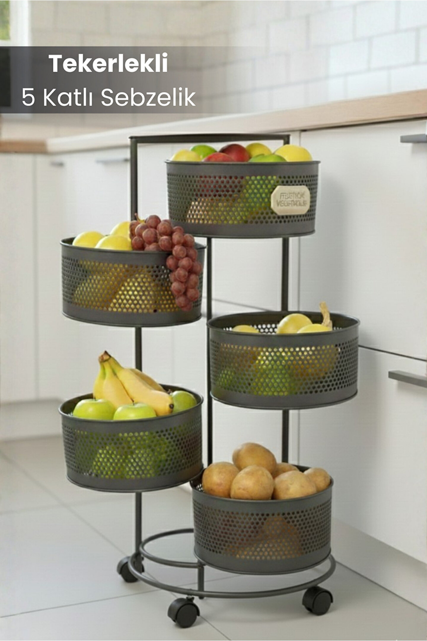 Orvila 5 Katlı Tekerlekli Tepsili Metal Sebzelik Açılır Patates Soğan Meyvelik Sepeti Raf Antrasit Gri