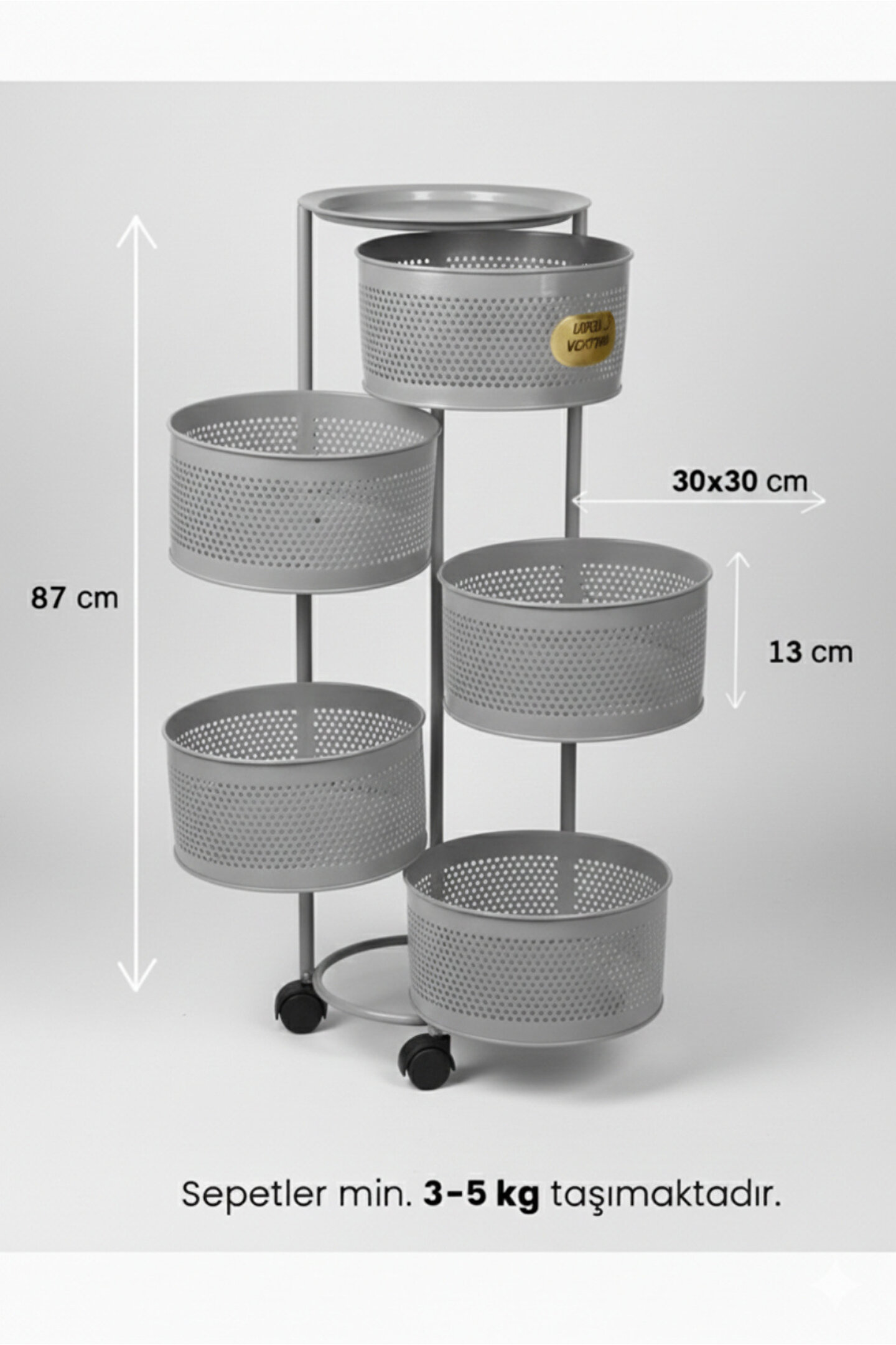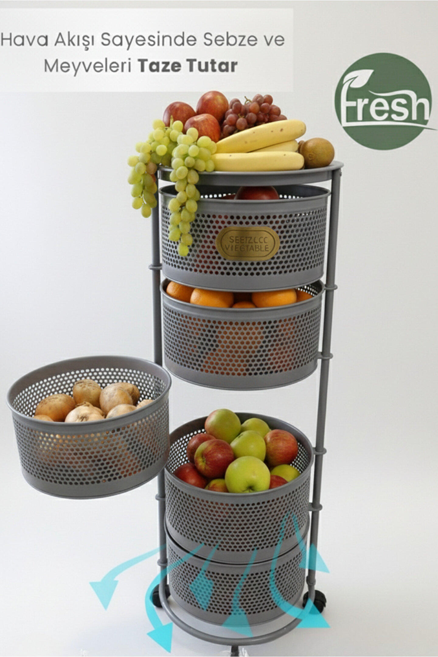 Tekerlekli sebzelik ve meyvelik ile mutfak, balkon ve kiler alanlarınızda maksimum düzen ve depolama alanı sağlar; Dayanıklı metal gövdesi sayesinde uzun ömürlü ve sağlam kullanım sunar; Delikli sepet tasarımı hava sirkülasyonunu artırarak sebze ve meyvelerin daha uzun süre taze kalmasına yardımcı olur; geniş raf yapısı ile patates, soğan, meyve, sebze ve mutfak ürünlerini düzenli şekilde saklamanızı sağlar; 360 derece dönebilen kilitlenebilir tekerlekleri sayesinde kolay taşınır ve sabitlenebilir kullanım imkânı sunar; Minimal ve modern beyaz rengi ile her mutfak dekorasyonuna uyum sağlar; Sepetler kolayca çıkarılıp temizlenebilir yapıdadır, hijyenik kullanım sunar; Mutfak tezgâhı altı, kiler, balkon ve servis alanlarında çok amaçlı kullanım için uygundur; Kurulum gerektirmeyen pratik tasarımı sayesinde hızlıca kullanıma hazır hale gelir; Yer kaplamayan dikey tasarımı ile dar alanlar için ideal bir depolama çözümüdür.;
