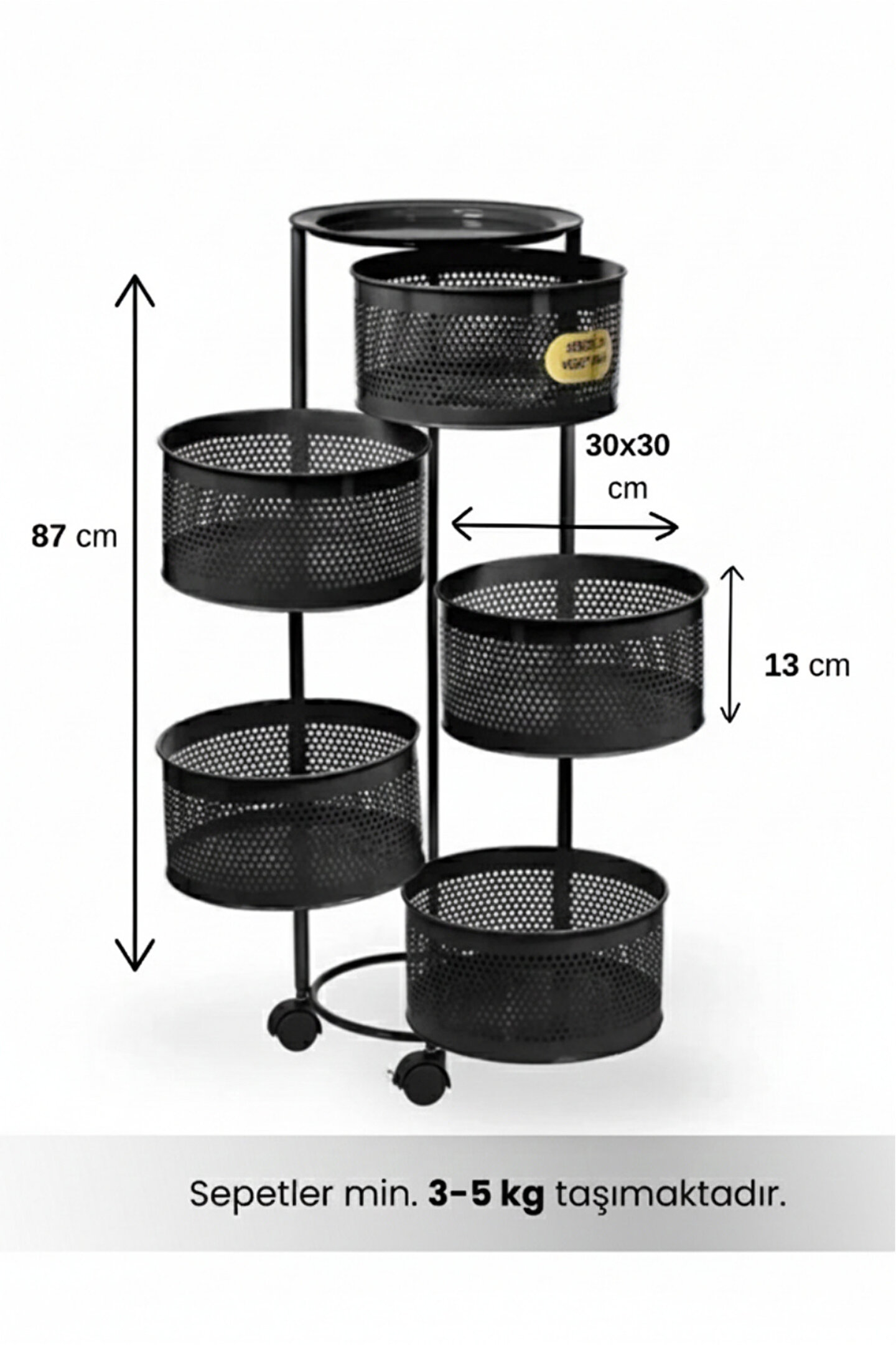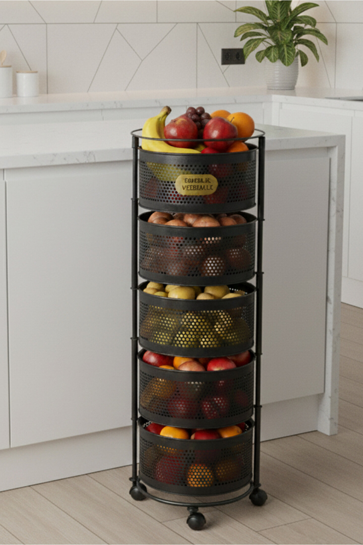 Tekerlekli sebzelik ve meyvelik ile mutfak, balkon ve kiler alanlarınızda maksimum düzen ve depolama alanı sağlar; Dayanıklı metal gövdesi sayesinde uzun ömürlü ve sağlam kullanım sunar; Delikli sepet tasarımı hava sirkülasyonunu artırarak sebze ve meyvelerin daha uzun süre taze kalmasına yardımcı olur; geniş raf yapısı ile patates, soğan, meyve, sebze ve mutfak ürünlerini düzenli şekilde saklamanızı sağlar; 360 derece dönebilen kilitlenebilir tekerlekleri sayesinde kolay taşınır ve sabitlenebilir kullanım imkânı sunar; Minimal ve modern beyaz rengi ile her mutfak dekorasyonuna uyum sağlar; Sepetler kolayca çıkarılıp temizlenebilir yapıdadır, hijyenik kullanım sunar; Mutfak tezgâhı altı, kiler, balkon ve servis alanlarında çok amaçlı kullanım için uygundur; Kurulum gerektirmeyen pratik tasarımı sayesinde hızlıca kullanıma hazır hale gelir; Yer kaplamayan dikey tasarımı ile dar alanlar için ideal bir depolama çözümüdür.;