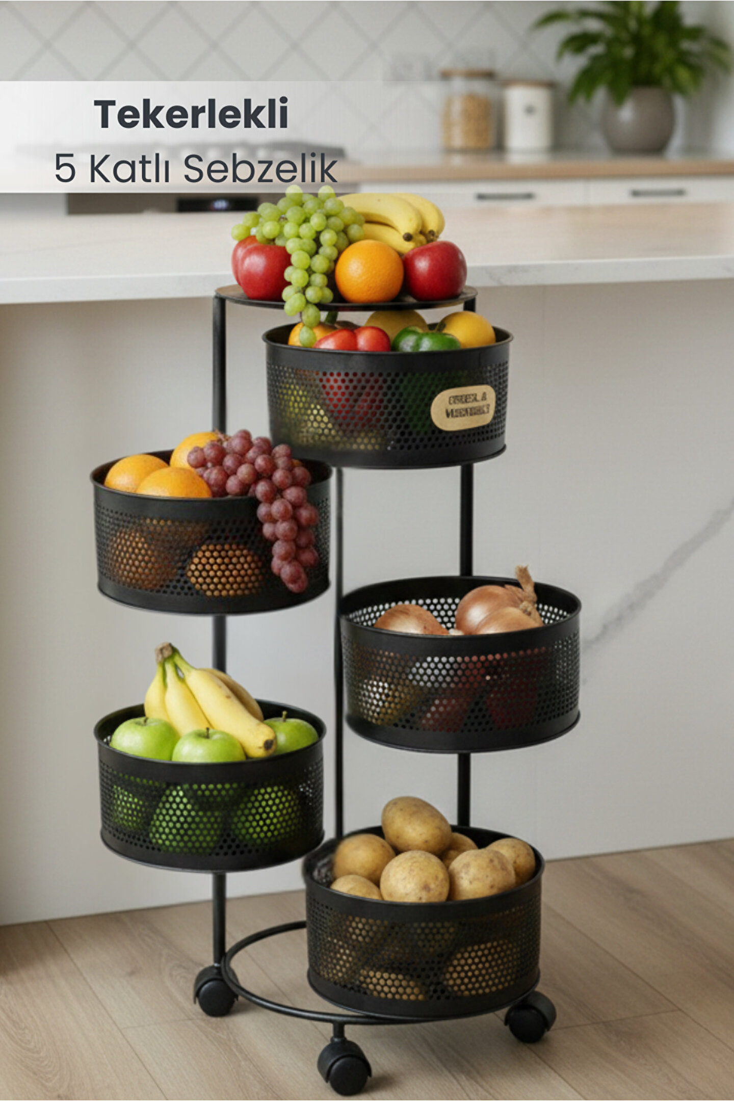 Orvila 5 Katlı Tekerlekli Tepsili Metal Sebzelik Açılır Patates Soğan Meyvelik Sepeti Raf SİYAH
