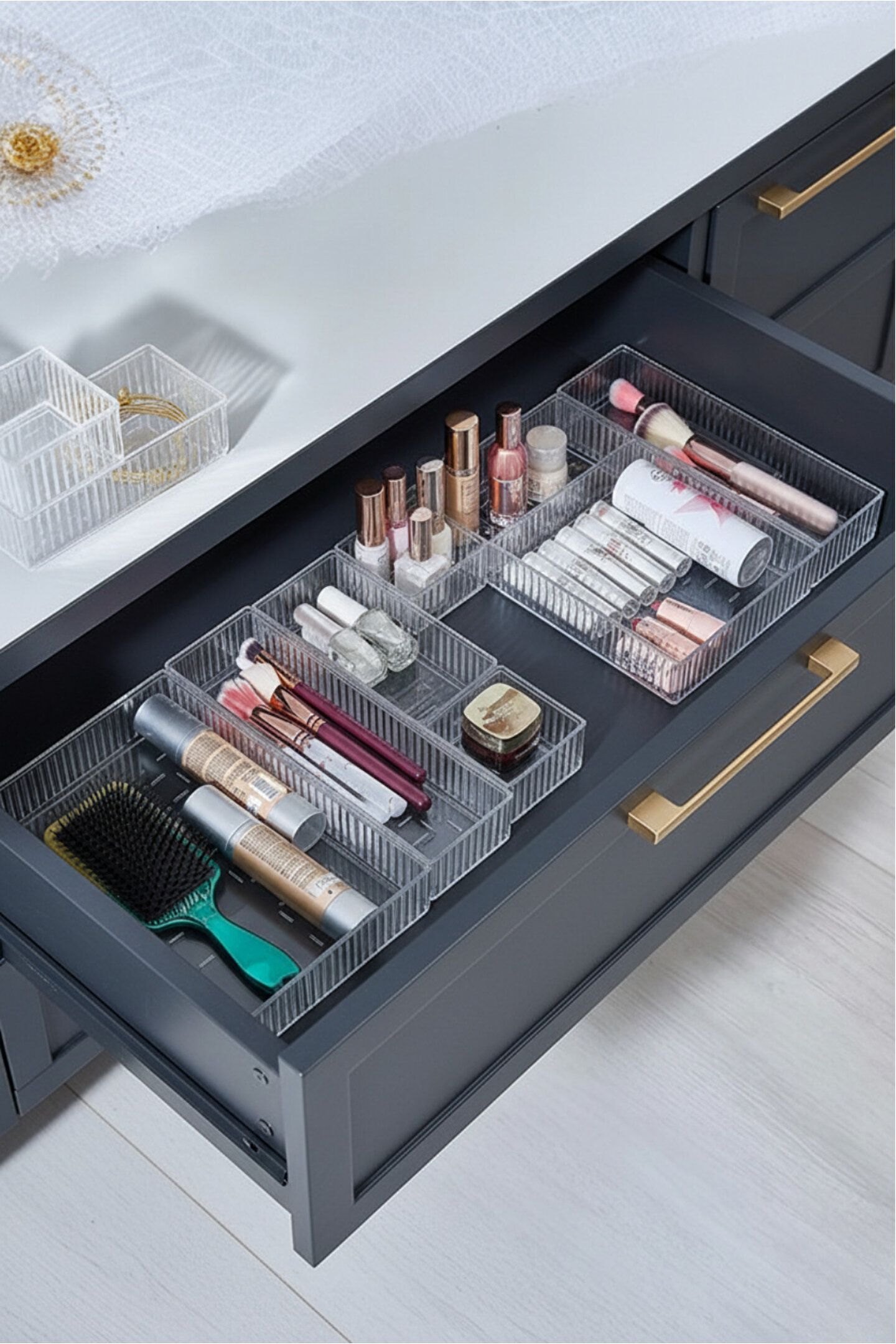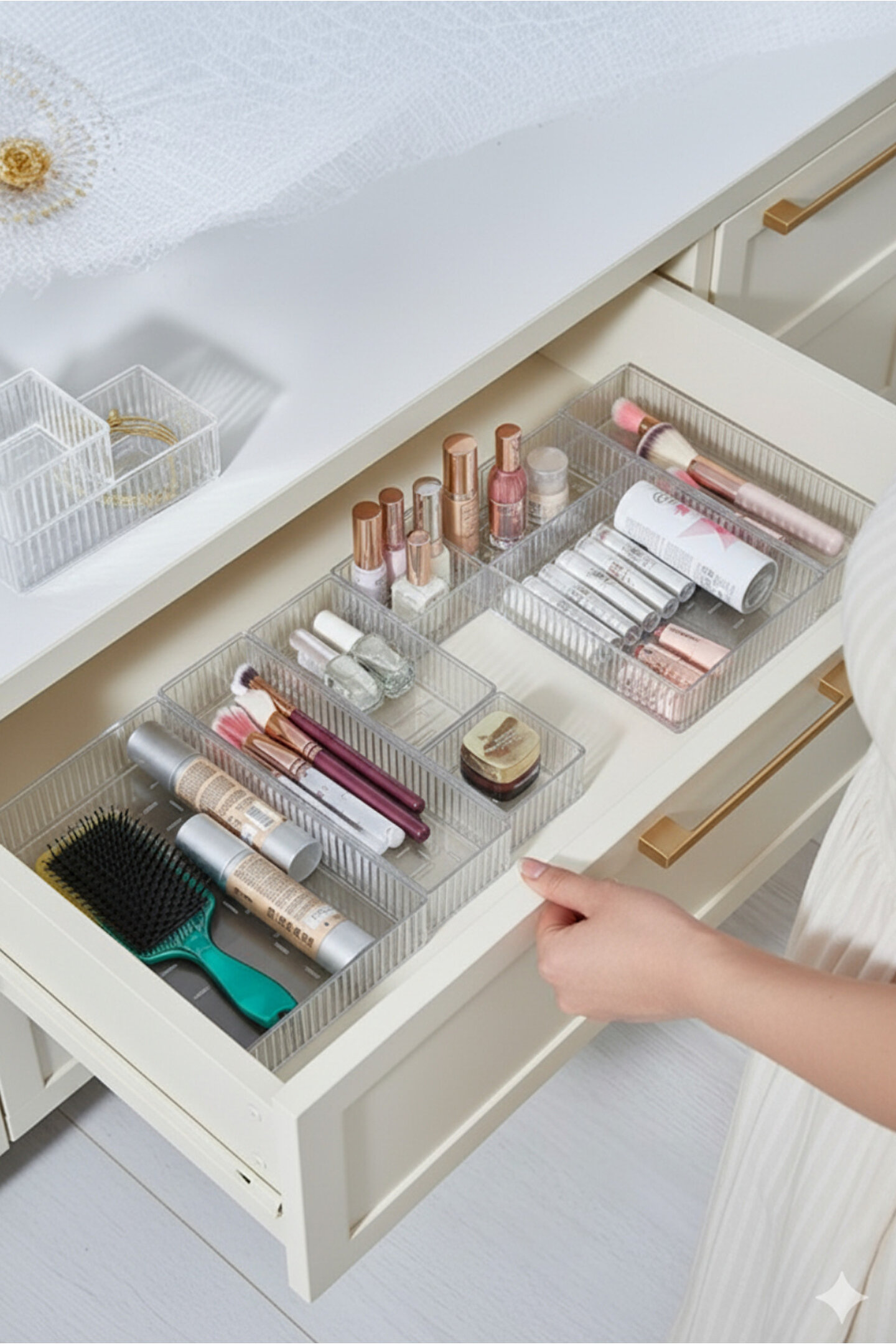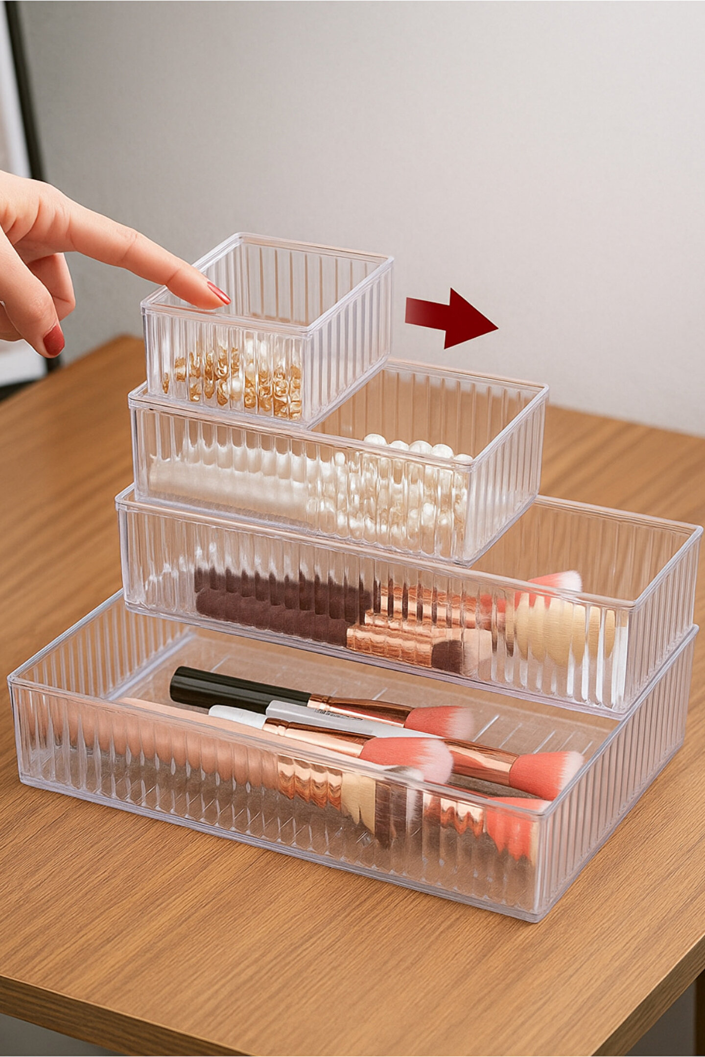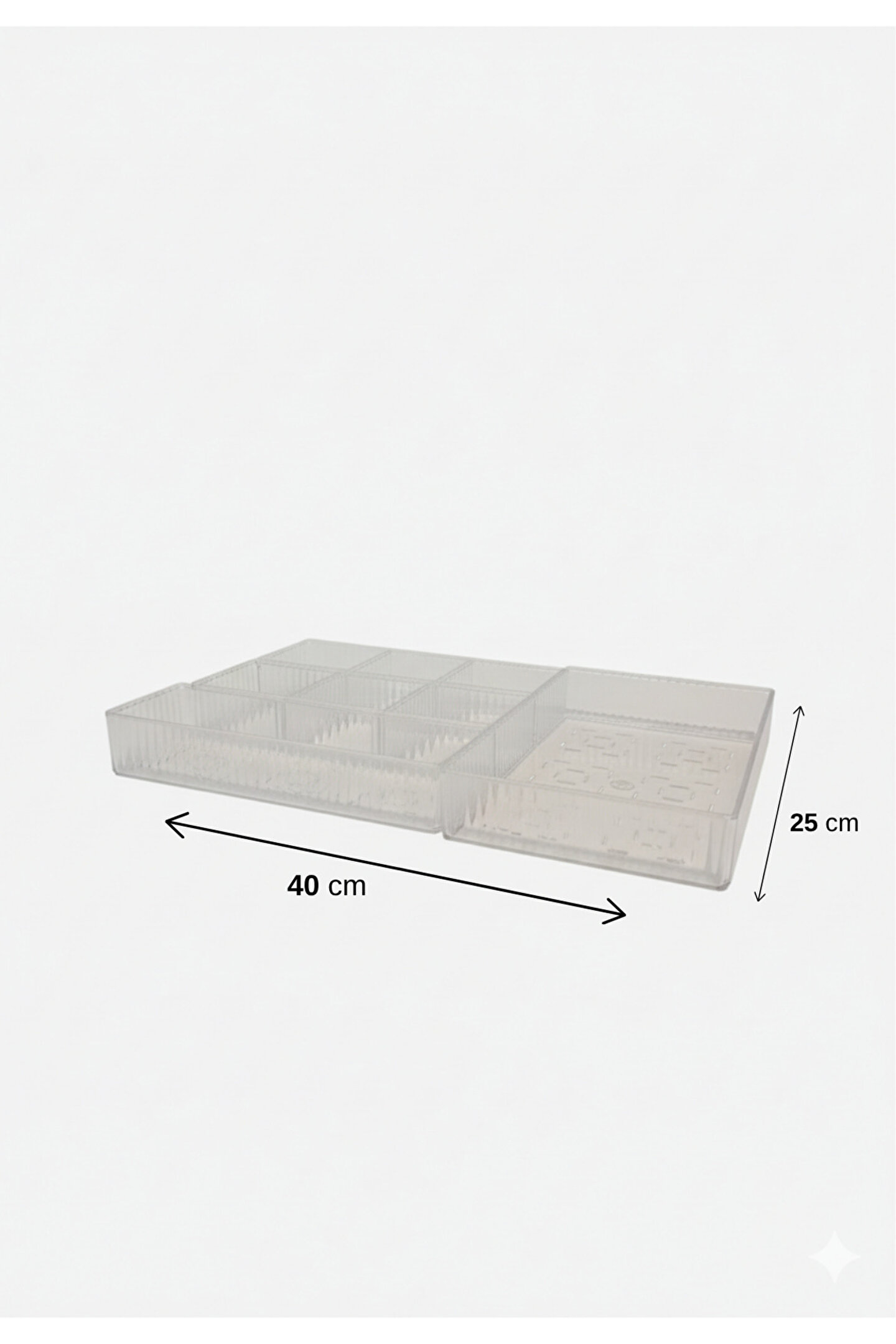 Şeffaf çekmece içi makyaj ve aksesuar düzenleyici organizer seti; farklı boyutlardaki modüler kutuları sayesinde ruj, oje, makyaj fırçası, serum, krem, parfüm testerı, tarak, takı ve kişisel bakım ürünlerini kategorize ederek düzenli bir şekilde saklamayı sağlar; şeffaf yapısı ile çekmece içinde tüm ürünleri kolayca görmenize olanak tanır; alan verimliliğini artırarak dağınıklığı ortadan kaldırır; kaydırmaz ve dayanıklı malzemesiyle uzun süreli kullanım sunar; modern çizgili tasarımıyla makyaj masası, banyo ve giyim odası çekmecelerinde estetik bir görünüm oluşturur; hafif ve taşınabilir yapısıyla ihtiyaç duyduğunuzda kolayca yeniden düzenleme imkânı sağlar; hijyenik depolama yapısıyla kozmetik ürünlerinizi tozdan ve karışıklıktan koruyarak her zaman düzenli bir kullanım alanı sunar; Ölçüsü 1 adet 25x16 cm 1 adet 25x8 cm 2 adet 16x8 cm 2 adet 8x8 cm