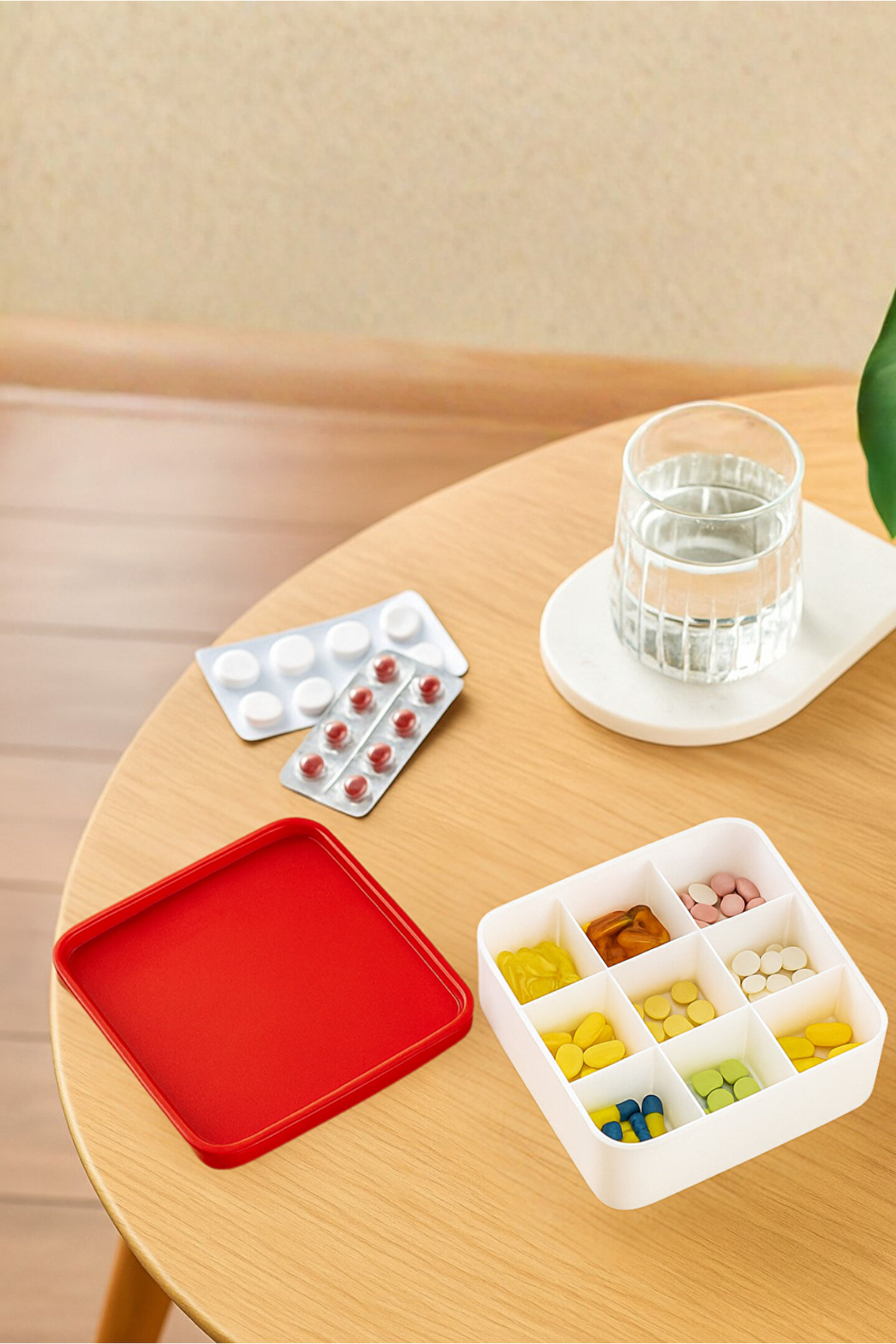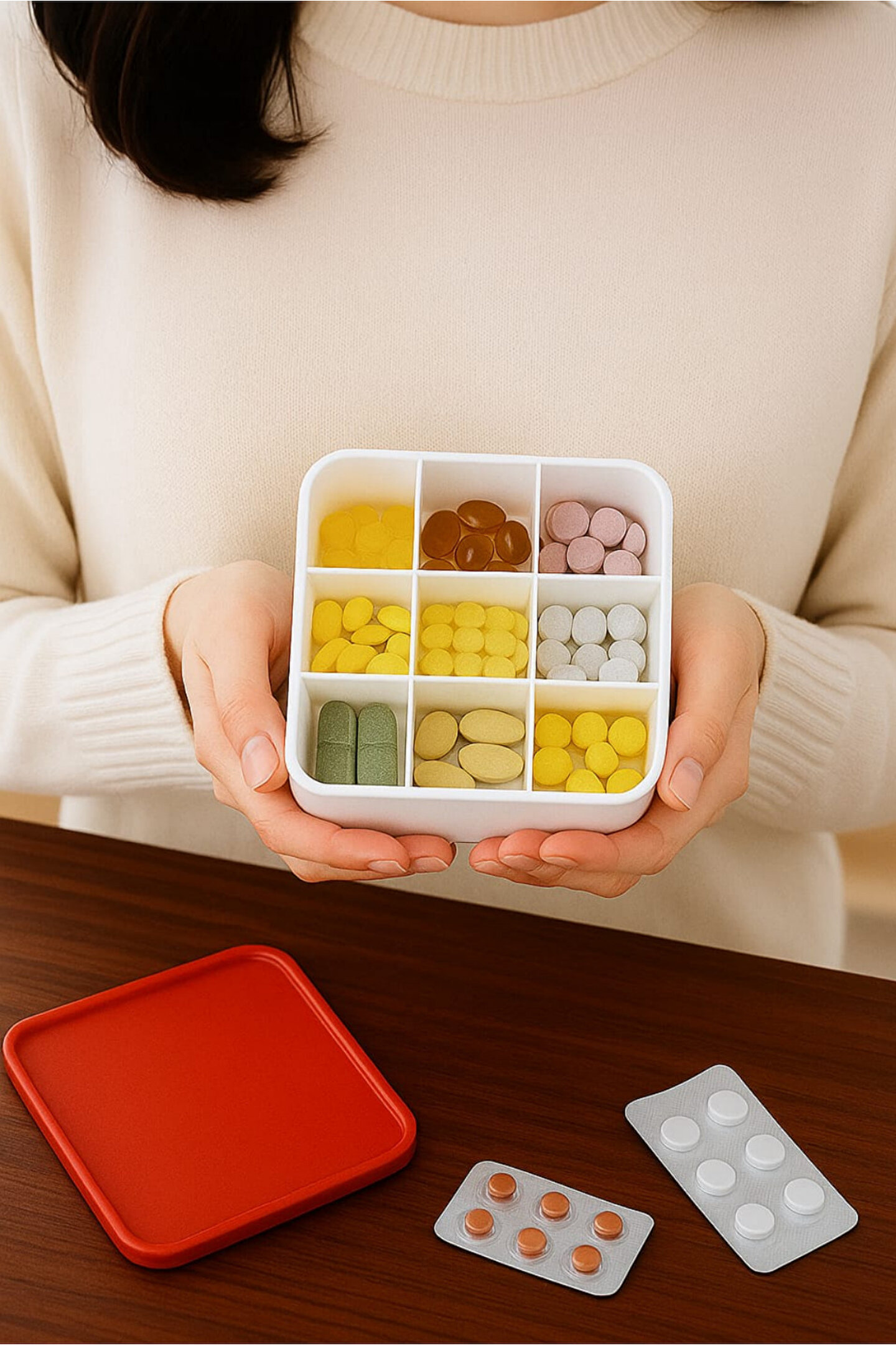 9 Gözlü İlaç ve Vitamin Düzenleyici Kutu; günlük, haftalık ve aylık hap kullanımını pratik şekilde organize etmek isteyenler için tasarlanmış ergonomik bir saklama çözümüdür; 9 bölmeli iç yapısı sayesinde vitamin, takviye edici gıdalar, reçeteli ilaçlar, ağrı kesiciler ve kapsülleri karışmadan güvenle depolamanıza yardımcı olur; kapağı sıkı kapanan yapısı ile çanta, valiz, ofis çekmecesi veya mutfak dolabında dökülme ve karışma riskini ortadan kaldırır; kompakt formu sayesinde az yer kaplar ve günlük kullanım için maksimum kolaylık sağlar; dayanıklı, sağlığa zararsız ve BPA içermeyen malzemeden üretilmiştir; evde yaşlı bireyler, düzenli ilaç kullananlar, sporcular, anneler ve yoğun iş temposunda düzen arayan herkes için ideal bir saklama kutusudur; şeffaf bölme tasarımı ile içindekileri tek bakışta görme imkânı sunar; çocuk kilidi özellikli kapak yapısı sayesinde güvenli bir kullanım sağlar; her vitamin ve hap için ayrı göz sunarak karışıklığı, doz atlamayı ve yanlış ilaç kullanımını önler; modern ve minimalist tasarımıyla hem şık hem de fonksiyonel bir düzenleme ürünü olarak yaşam alanlarınıza uyum sağlar; Ölçüsü 13,5x13,5 cm dir;