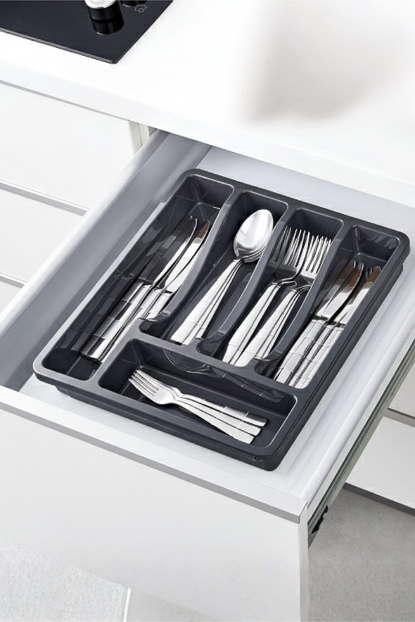 Ayarlanabilir kaşıklık düzenleyici; mutfak çekmecelerini düzenli ve kullanım açısından pratik hale getirmek için tasarlanmış çok bölmeli bir düzenleme aparatıdır; genişletilebilir yapısı sayesinde farklı çekmece ölçülerine uyum sağlar; çatal, kaşık, bıçak, servis malzemeleri ve mutfak gereçlerini kategorilere ayırarak hızlı erişim sağlar; dayanıklı ve uzun ömürlü plastik yapısı ile gündelik kullanımda deformasyon oluşmasını engeller; kaymaz yüzeyi sayesinde çekmece içinde sabit durur ve kayma yapmaz; hijyenik materyalden üretilmiş olup kolay temizlenebilir, elde veya nemli bezle hızlıca silinebilir; modern ve minimal tasarımıyla mutfak dekorasyonuna uyum sağlar; geniş iç hacmi sayesinde kalabalık mutfak gereçlerini bile düzenli bir şekilde yerleştirmenize imkân tanır; tekli, çoklu veya yan yana kullanım için idealdir; servis kaşığı, bıçak, çay kaşığı ve yemek çatalı gibi farklı boyuttaki ürünler için özel bölmeleri bulunur; mutfak çekmecelerinde düzen sağlar, dağınıklığı azaltır ve alan kullanımını verimli hale getirir; pratik kurulumu sayesinde çekmeceye yerleştirmeniz yeterlidir, ek montaj gerektirmez; yüksek kalite malzemesi sayesinde uzun süre ilk günkü formunu korur; ev mutfakları, ofis mutfakları ve karavanlar için mükemmel bir düzenleme çözümüdür.; Kapalı hali ölçüsü 32,5x28,5 cm açık hali 48,5x32,5 cm
