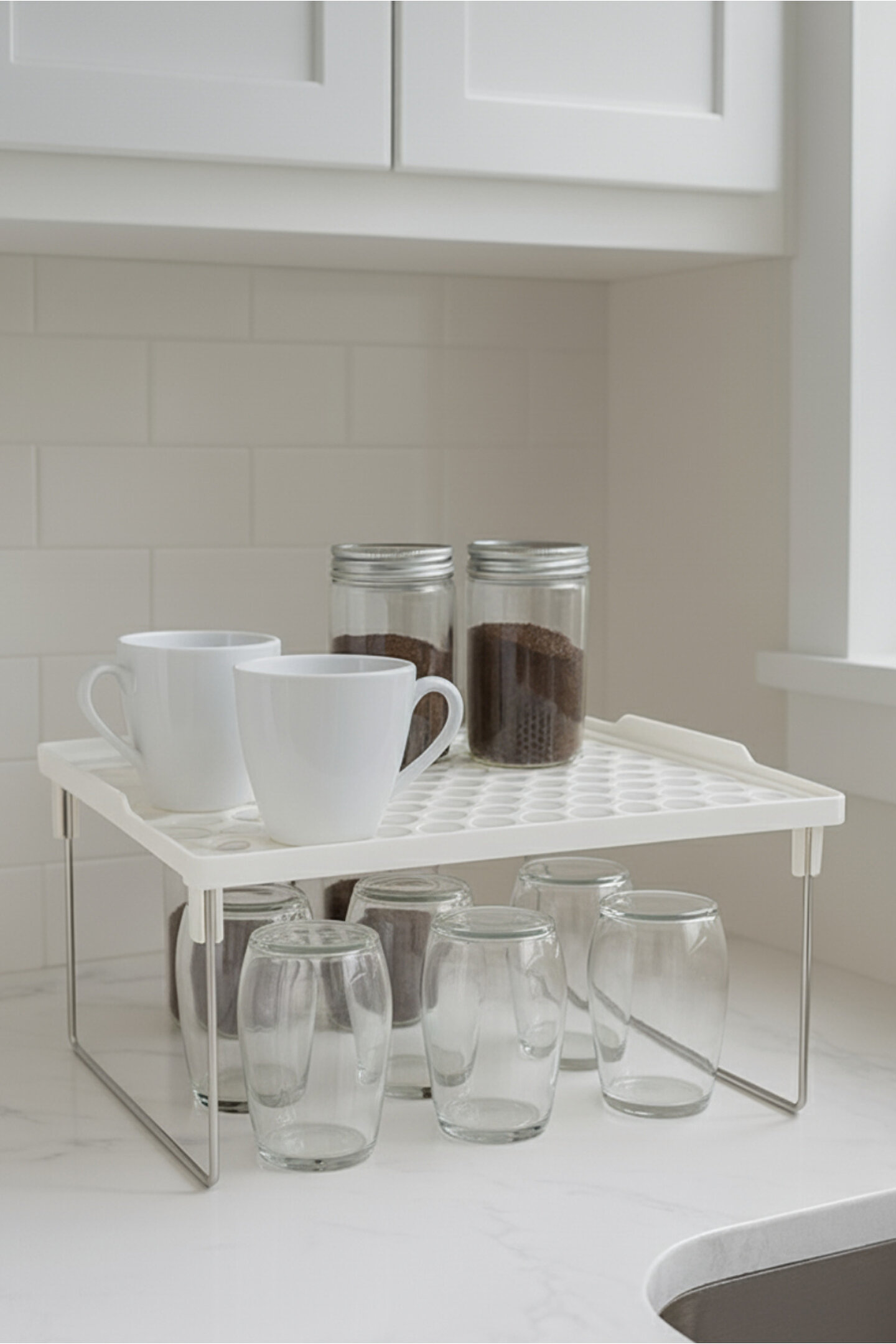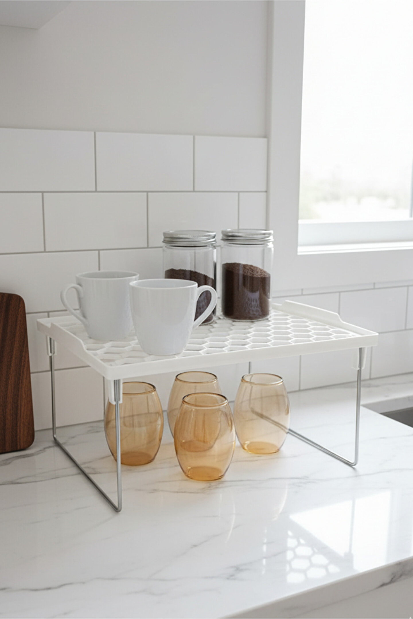 Mutfak dolabı içi düzenleyici raf; bardak, kupa, sürahi ve cam ürünleri iki katlı akıllı tasarımıyla düzenli ve erişilebilir şekilde yerleştirerek dolap içi alan kullanımını en üst seviyeye çıkarır; sağlam metal ayakları ile yüksek taşıma kapasitesi sunar; kaymaz ve dayanıklı yüzeyi sayesinde uzun yıllar formunu korur; modern, minimal ve şık görünümü tüm mutfak dolabı modelleriyle uyumludur; kırılabilir cam ürünleri güvenli şekilde konumlandırarak çarpma ve devrilme riskini azaltır; düzenli depolama sağlar, dolap karmaşasını ortadan kaldırır ve mutfakta aradığınız ürünü çok daha hızlı bulmanıza yardımcı olur; hijyenik yüzey yapısı kolay temizlenir ve leke tutmaz; hem küçük mutfaklarda alan açmak hem de geniş mutfaklarda profesyonel bir düzen elde etmek için ideal pratik düzenleyici çözümdür; dekoratif duruşu ile dolap içi estetiğini güçlendirir; mutfak düzenini korumanıza yardımcı olur ve kullanım kolaylığı sağlayarak günlük hayatınızı daha konforlu hale getirir.; Ölçüsü 29,5x27 cm yükseklik 14,5 cm