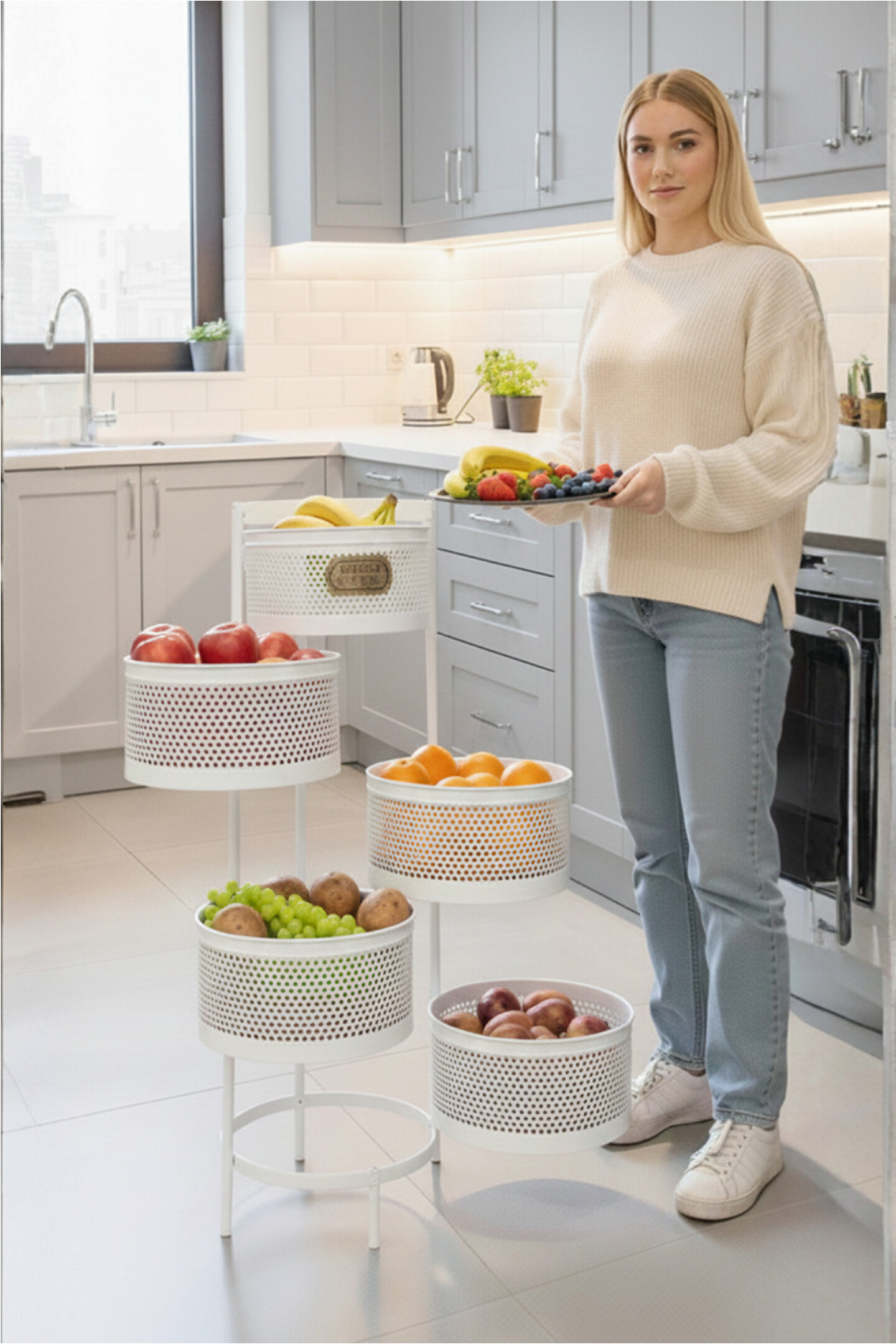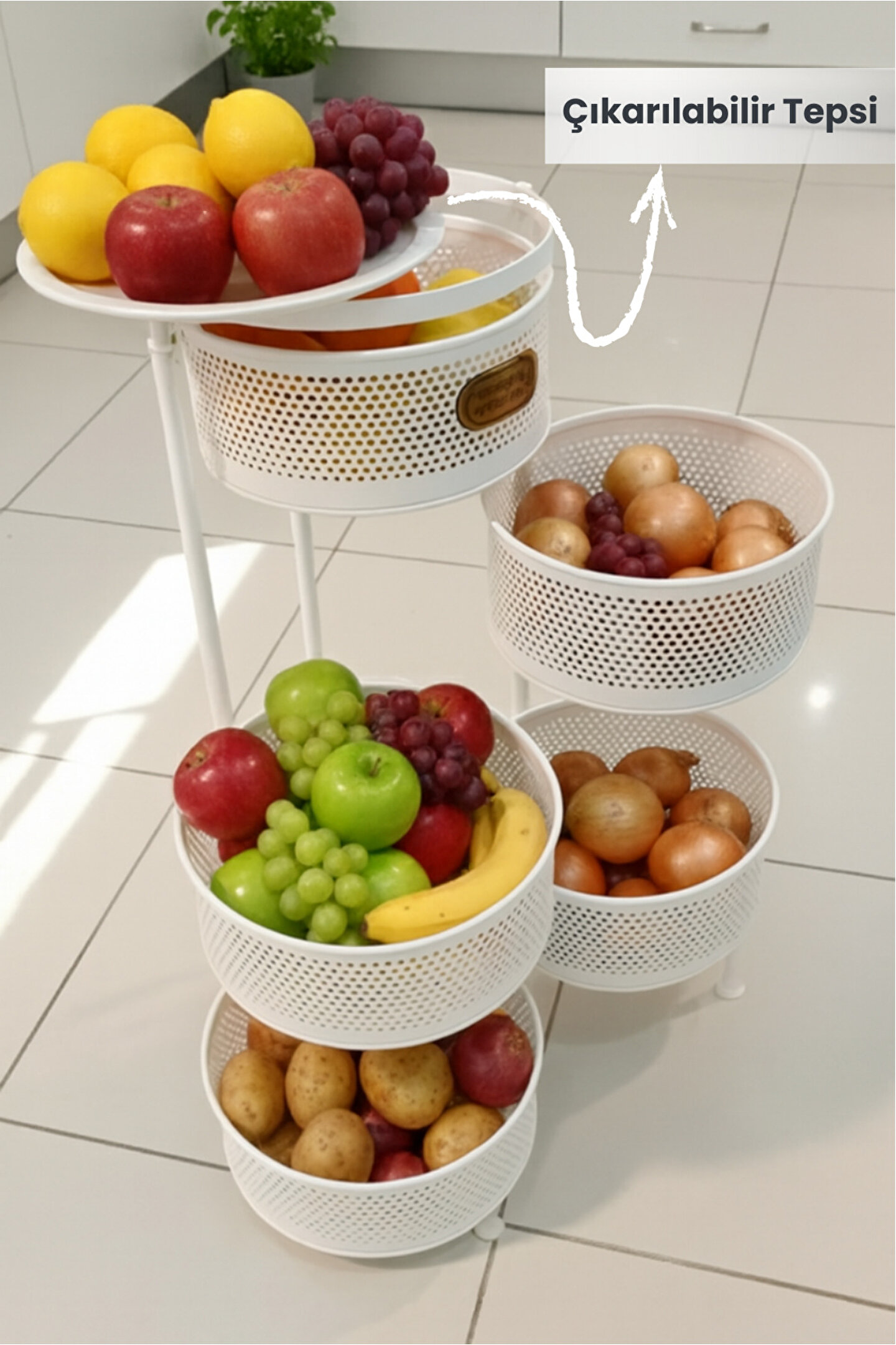 Ölçüler: Sepetler : 30x30 Cm; Sepet Yüksekliği : 13 cm ; Toplam Yükseklik : Yükseklik : 87 cm; Mutfak tezgâhında ya da evinizin başka alanlarında ekstra depolama alanına ihtiyaç duyanlar.; Sebze ve meyvelerini düzenli şekilde saklamak isteyenler.; Evleri küçük olan, alanı verimli kullanmak isteyenler.; Kolayca hareket ettirip gerektiğinde sabitlemek isteyen kullanıcılar.;