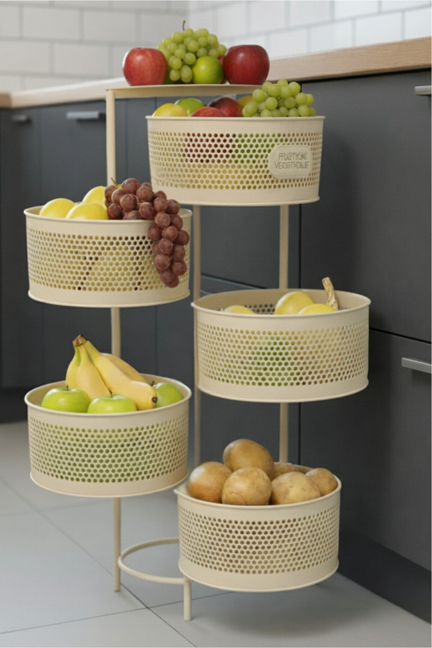 Metal Sebzelik 5 Katlı Tepsili Açılır Metal Patates Soğan Meyvelik Sepeti Rafı Krem