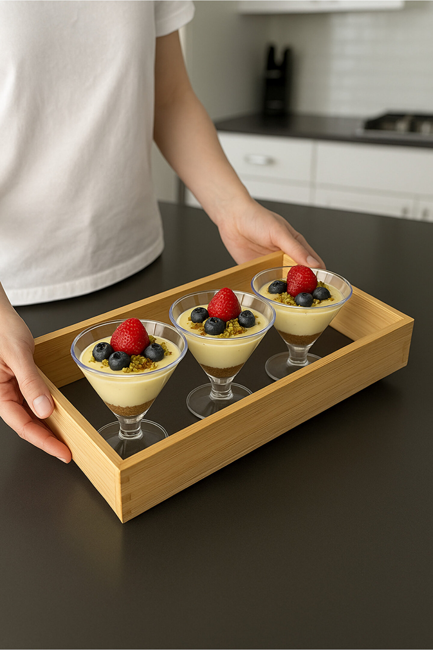 6'lı tatlı sunum bardağı; şık ve modern tasarımıyla özel günlerde, davetlerde ve günlük sunumlarda estetik bir görünüm sağlar; plastik malzemeden üretilmiş olup cam değildir; hafif ve taşınabilir yapısı sayesinde pratik kullanım sunar; kırılmaya karşı dayanıklı yapısıyla çocuklu aileler için idealdir; sütlaç, magnolya, muhallebi, tiramisu, dondurma, meyve tatlıları ve mini ikramlıklar için mükemmel sunum imkânı sunar; şeffaf gövdesi sayesinde hazırladığınız tatlıların katmanlarını estetik şekilde sergiler; tek kullanımlık değildir ve tekrar tekrar kullanılabilir; bulaşık makinesinde düşük ısıda yıkanabilir; parlak ve pürüzsüz yüzeyi hijyenik kullanım sağlar; kafe, restoran, pasta atölyesi, butik işletmeler ve ev kullanımı için uygundur; hafif yapısı sayesinde toplu organizasyonlarda taşımaya elverişlidir; davet masalarında, doğum günü kutlamalarında, söz–nişan sunumlarında dekoratif bir görünüm oluşturur; minimal ve zarif formu sayesinde her sofrada uyumlu bir sunum atmosferi yaratır; tatlılarınızı düzenli ve profesyonel bir görüntüyle sunmanıza yardımcı olur.; Ölçüsü Çap 10,5 cm Yükseklik 10 cm dir.;