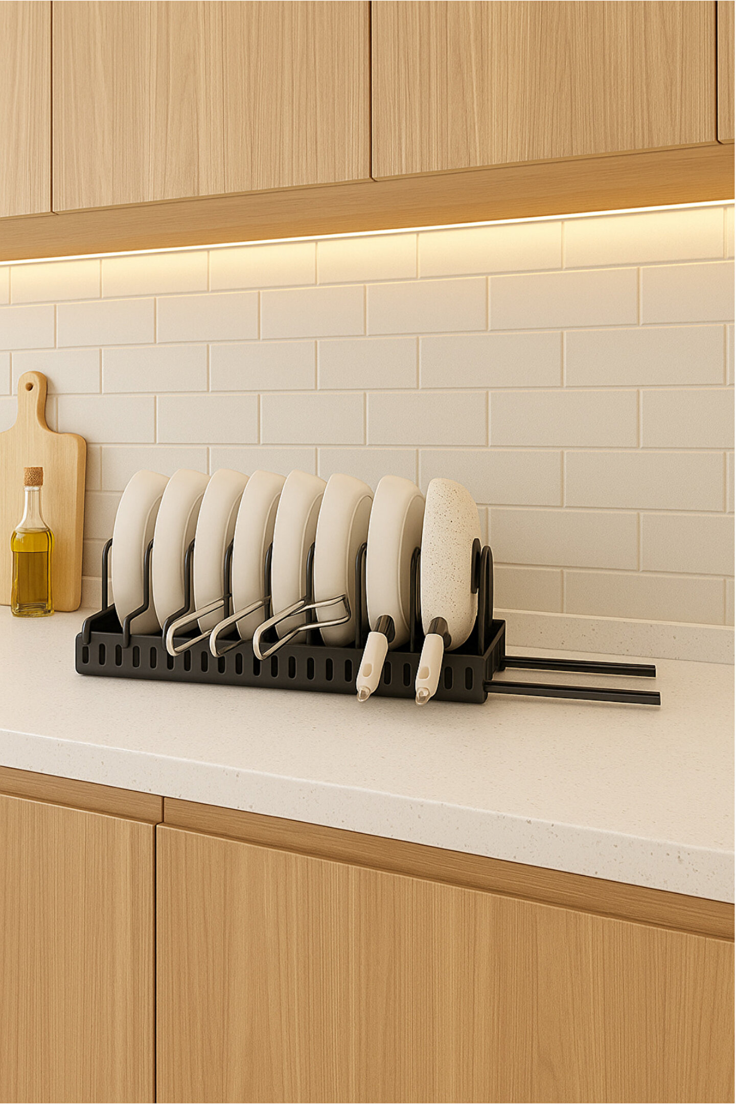 Mutfakta düzeni yeniden tanımlayın! 8 bölmeli raylı organizer, tencere kapakları, tavalar, baharatlıklar ve mutfak aksesuarlarını tek bir alanda düzenli şekilde saklamanızı sağlar; dayanıklı metal malzemesi sayesinde uzun ömürlü kullanım sunar; ölçüsü 40x25x15 cmdir.; raylı yapısı sayesinde kolay çekme ve yerleştirme imkânı verir; dolap içi, tezgâh altı veya çekmece içi kullanıma uygundur; modern tasarımıyla mutfağınıza hem şıklık hem de işlevsellik kazandırır.;