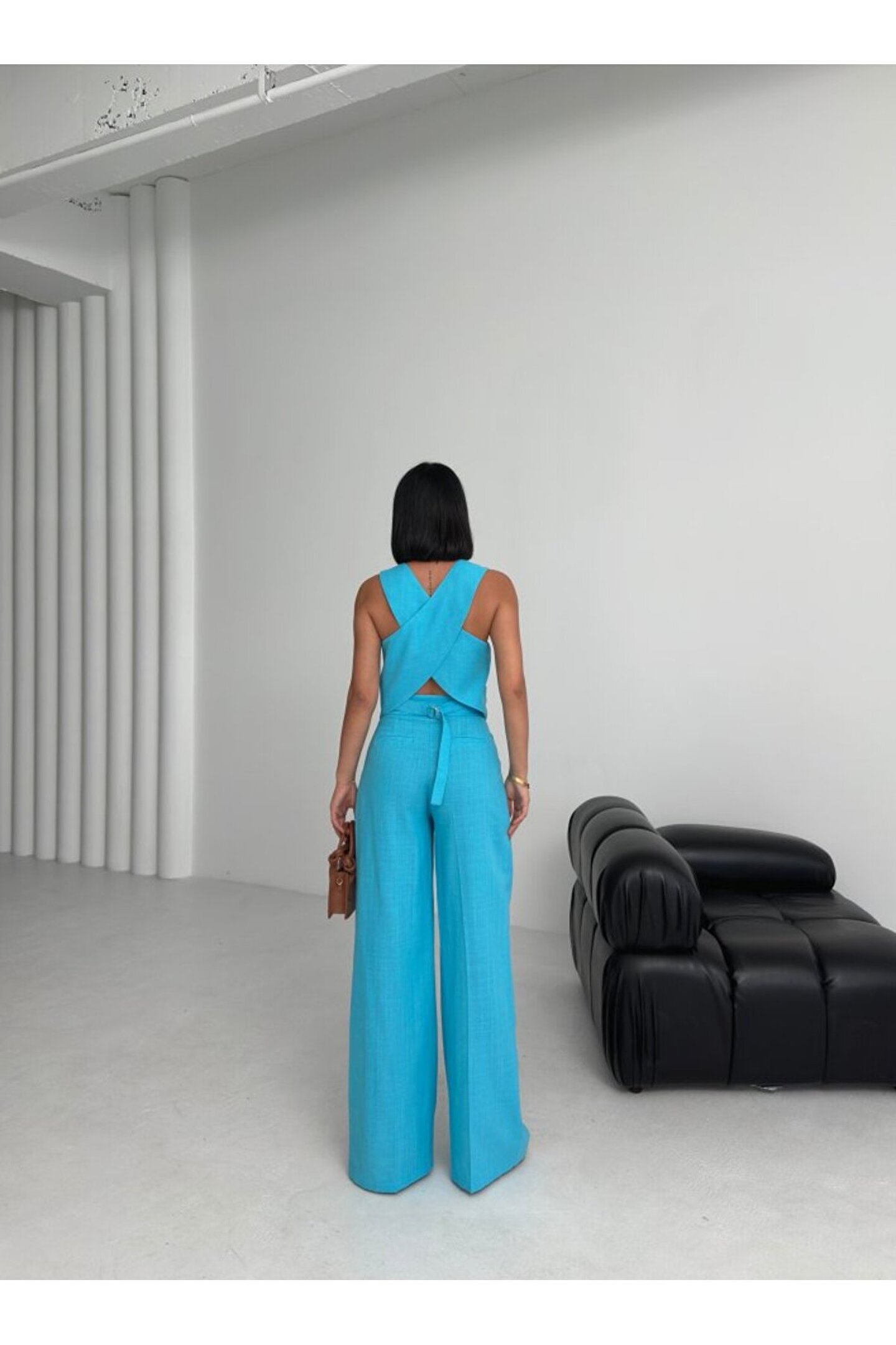 OUZ Fashion Kadın Keten Sırtı Çapraz Geçişli Cepken Pantolon İkili Takım
