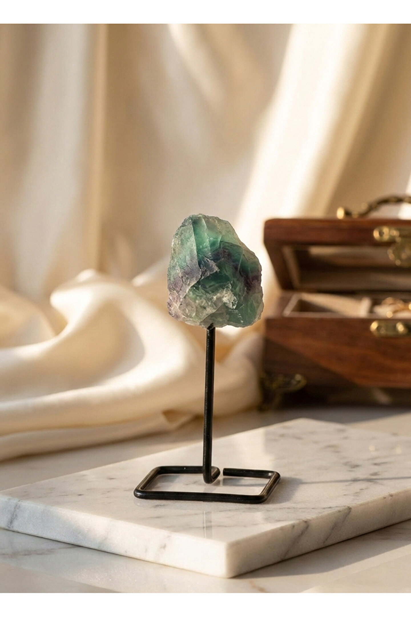 Florit Doğal Taş, Standlı Florit taşı, enerjiyi dengelemek ve zihinsel berraklığı artırmak için kullanılan, doğanın eşsiz güzelliklerinden biridir.; Stand üzerinde sergilenen bu doğal taş, sade ve etkileyici görünümüyle hem dekoratif bir obje hem de enerji düzenleyici olarak yaşam alanınıza katkı sağlar.; Özellikler: Doğal Taş: Florit Ortalama Ağırlık: 50-60 gram Ortalama Yükseklik: 10 cm Florit'in Özellikleri: Florit, çeşitli renk tonlarıyla dikkat çeken bir taştır; yeşil, mor ve mavi tonları doğada sıklıkla görülür.; Antik Roma'dan bu yana zihni sakinleştirici ve dengeleyici özelliği nedeniyle kullanılmıştır.; Aynı zamanda, kişisel gelişimi simgeleyen bir taştır ve tarihte önemli filozoflar tarafından manevi rehberlik için kullanıldığı söylenir.; Florit'in Faydaları: Florit taşı, zihinsel berraklığı artırmak, karmaşayı azaltmak ve odaklanmayı desteklemek için kullanılır.; Negatif enerjileri uzaklaştırarak kişinin kendine daha fazla güven duymasını sağlar.; Meditasyon esnasında da ruhsal dengeyi bulmak ve sakinleşmek için tercih edilen bir taştır.; Not: Her doğal taş, kendine özgü renk ve desenleriyle eşsizdir.; Bu nedenle florit taşınız, fotoğraftakilerden farklılık gösterebilir.;