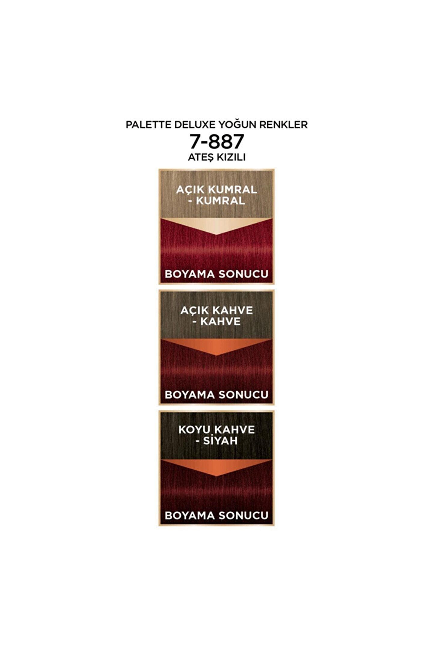Palette Deluxe Yoğun Renkler 7; 887 Ateş Kızılı, koyu saçlarda dahi yoğun bir renk sunar; Uzun süre kalıcı renkler ve göz alıcı parlaklık için denemelisiniz; KOYU SAÇLARDA BİLE YOĞUN RENK SONUCU: Koyu saçlarda bile görülebilir sonuç veren ve göz alıcı canlılık sağlayan Palette Deluxe Yoğun Renkler ile yenilenen saçların keyfine varın! Yüksek performanslı renk pigmentleri içeren krem boya, saç yapısına derinlemesine nüfuz eder; Yoğun parlaklık ile göz alıcı ve uzun süre kalıcı yoğun renk sonucu sağlar; SAF&DERİNLEMESİNE BAKIM: Boyama sonrası zengin bakım için Oleo; Gold Elixir, içerdiği değerli Argan Yağı ile saçları derinlemesine besler, saçların daha güzel görünmesini sağlar; Kutu İçeriği• 1 Tüp Kalıcı Krem Boya 50ml• 1 Oksidan Losyonlu Uygulama Şişesi 50ml• 1 Boyama Sonrası Saç Bakım Maskesi 15ml• 1 Çift Eldiven• 1 Kullanma Kılavuzu;