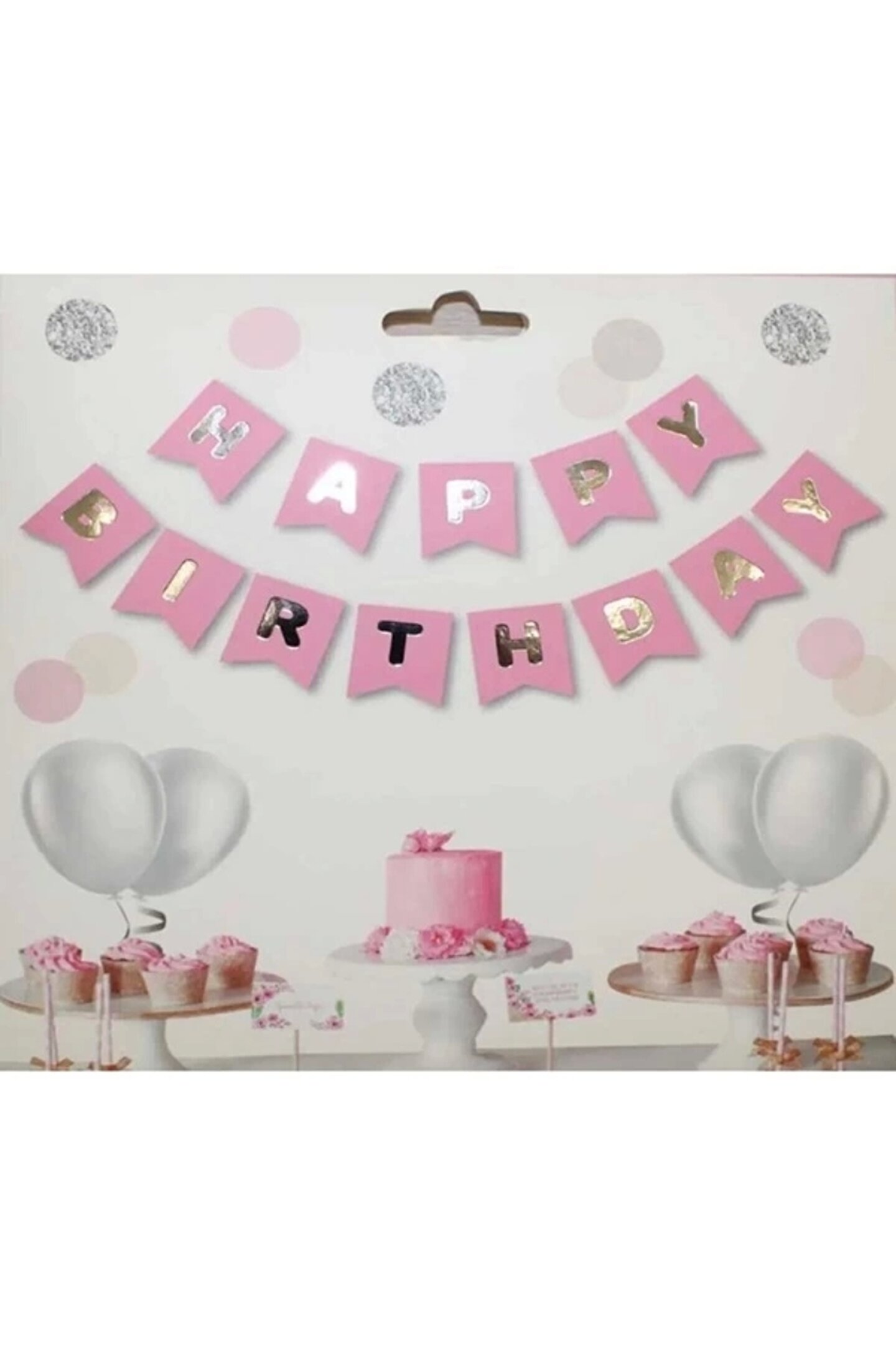Papatya Süs Evi Pembe Zemin Happy Birthday Gümüş Banner